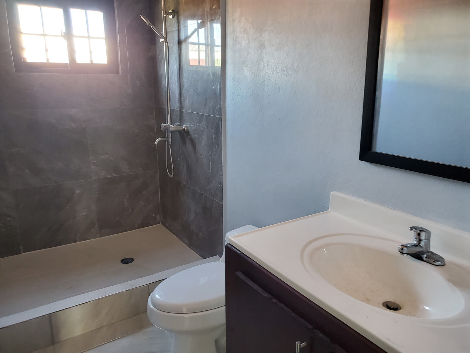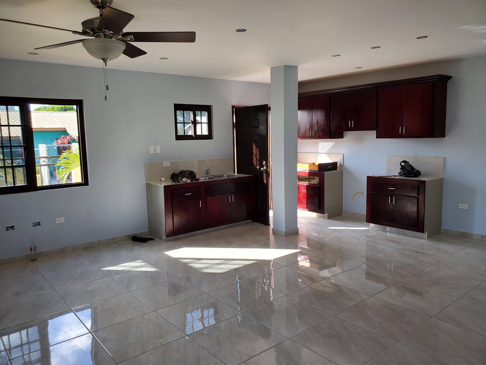 Upon entering the apartment, you are greeted by a spacious living, kitchen and dining room. The entire area is fully tiled with receding lights. The kitchen has beautiful cabinets for all your dishware and space for your appliances. The main bedroom, the largest of the two, can fit a king-size bed easily and is fitting with built in closets and a ceiling fan. The 2nd bedroom is similar and can also squeeze in a king-sized bed and is equipped with built in closets and a ceiling fan. The full bathroom features a beautifully tile standing shower with hot water and a modern vanity. There is also a laundry room that can hold a washer and dryer.