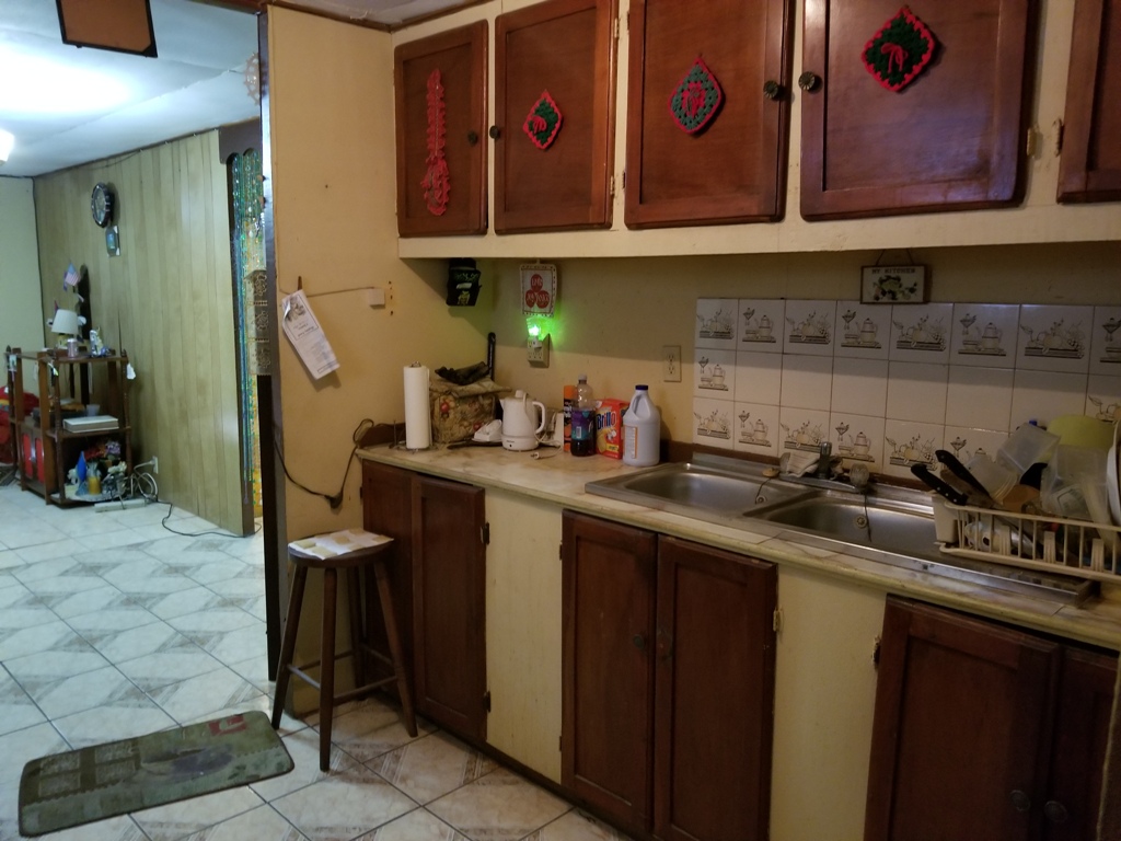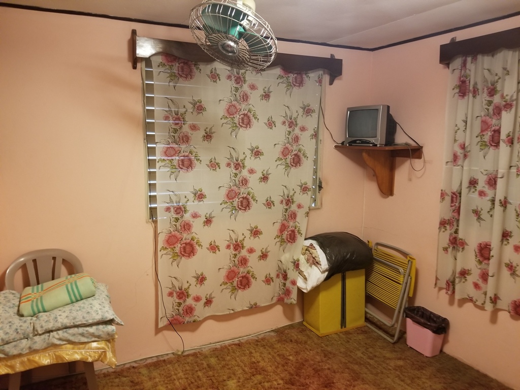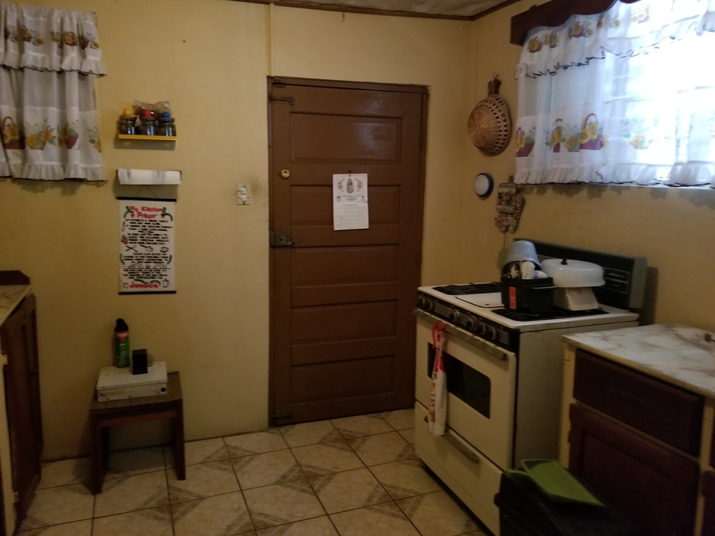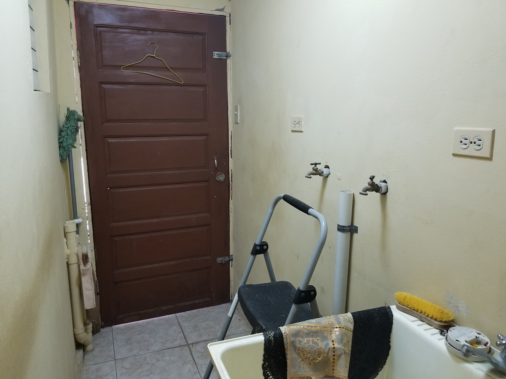 The ground floor of the house is a storage room and a cover car port for 2 cars. The house is raised roughly 10ft from the ground. The second floor has a small balcony that has the main door for the house. Upon entrance the home consist of an open dining kitchen and living room. Behind the kitchen is a laundry room that is wired for the washer and dryer. The bedrooms are large enough to fit a double bet comfortable and each consist of their own closet space. In between the two bedroom is the bathroom that has a tub.