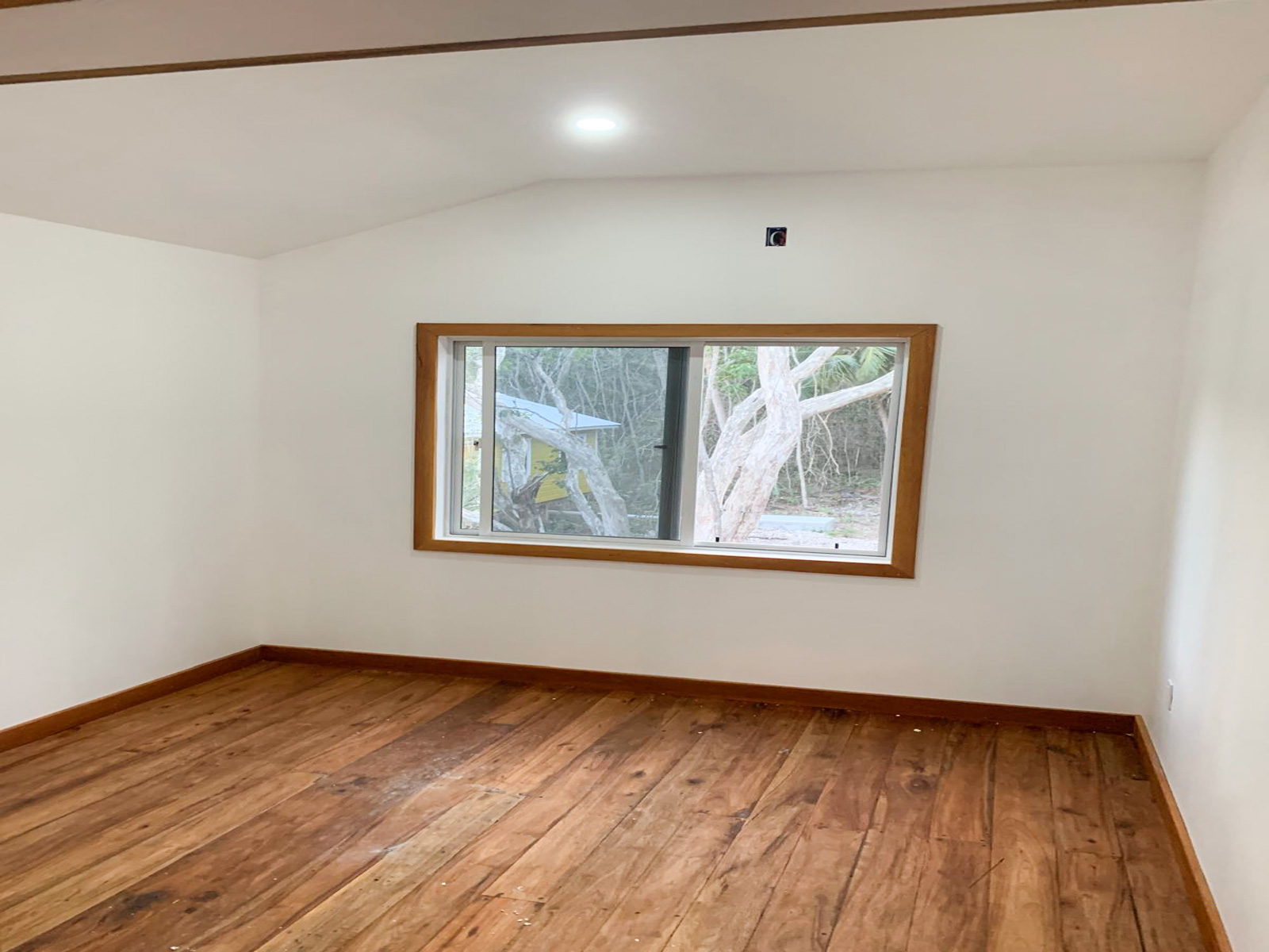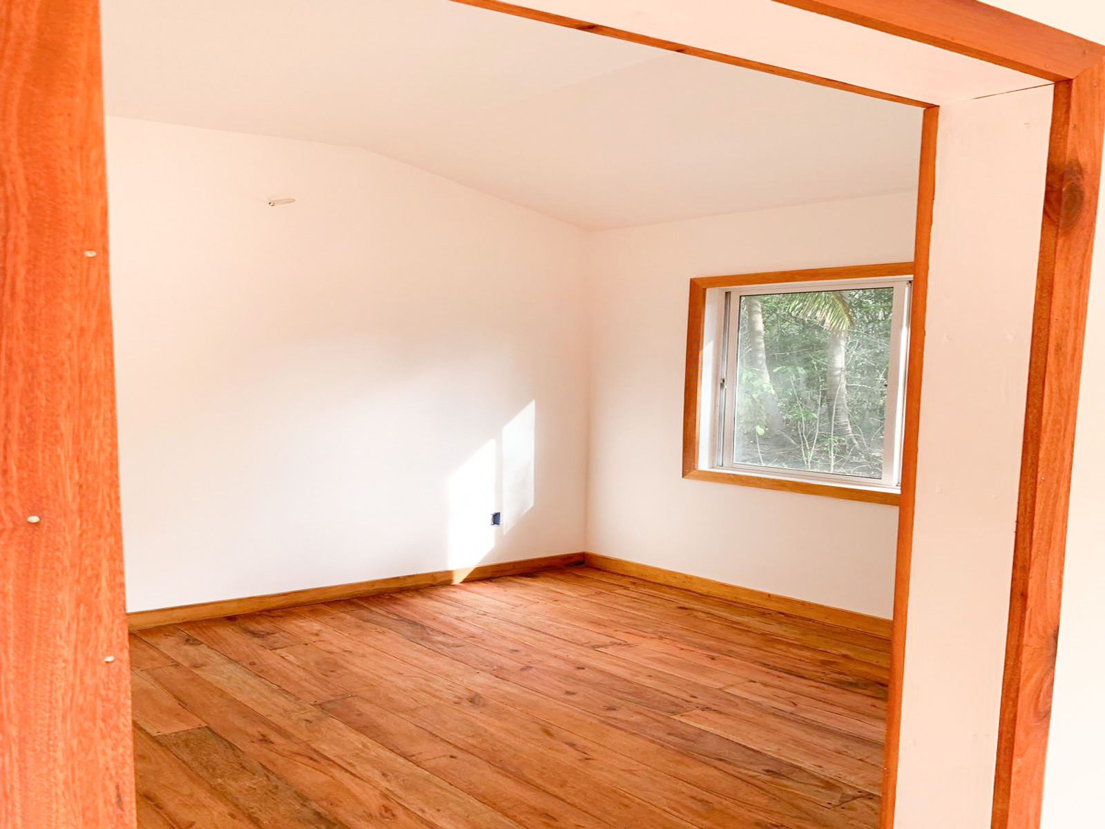 The smaller home offers 350 ft2 of living space and comprises two bedrooms, one bathroom, and an open-concept kitchen, living, and dining area. This property sits on concrete stilts 5ft tall and has a screened-in deck with a surface area of 96 ft2.