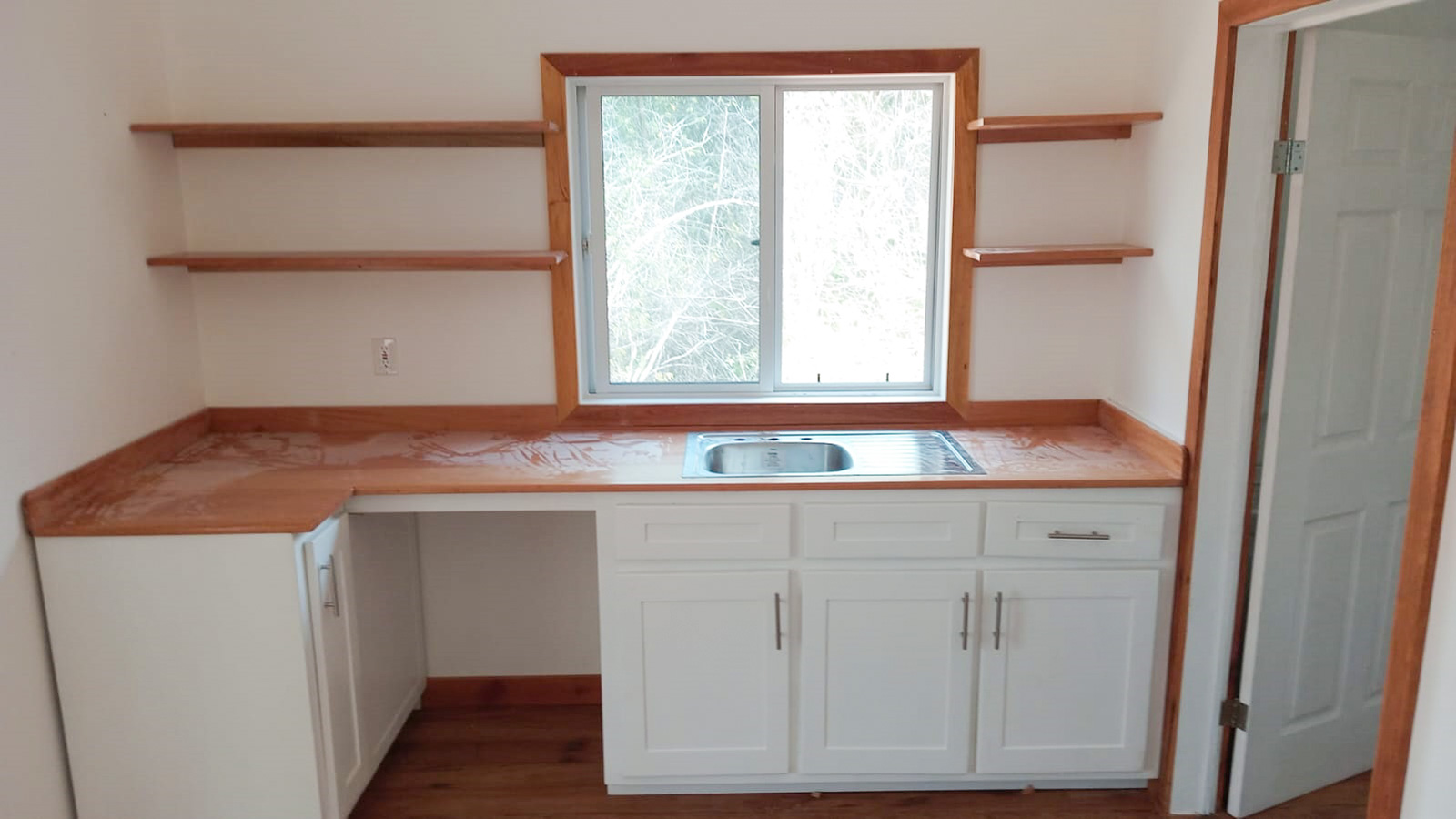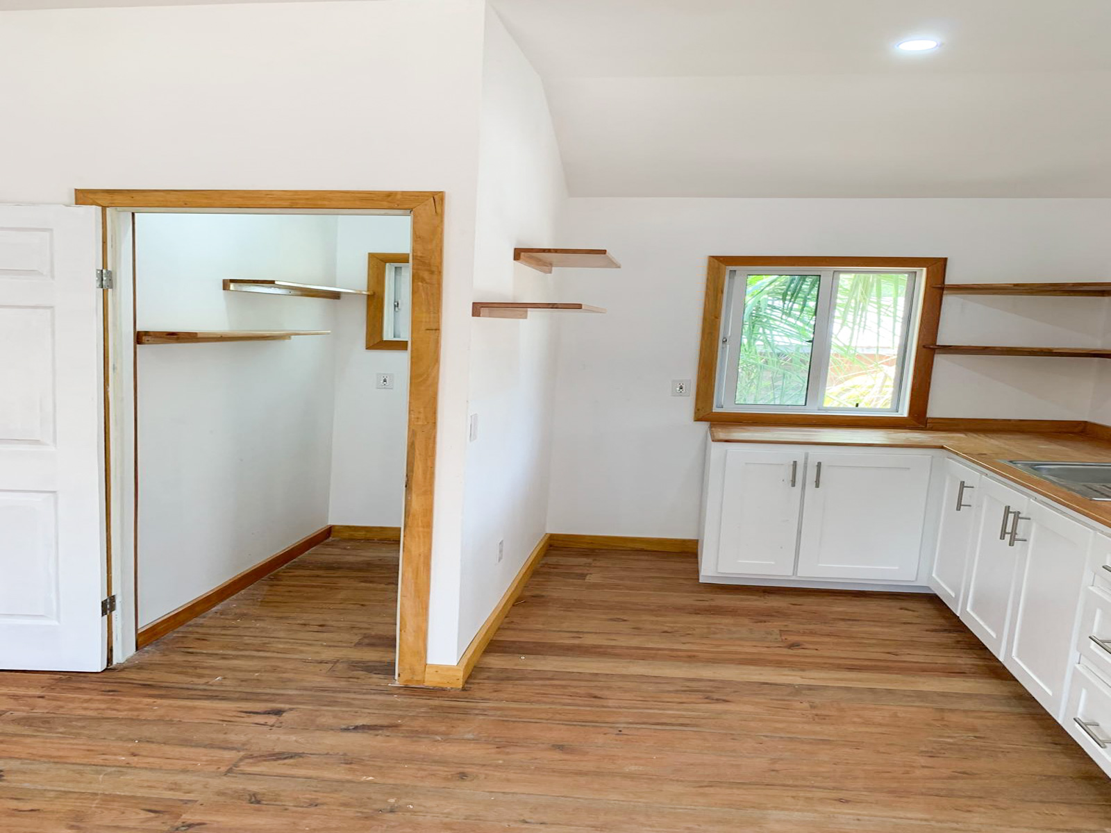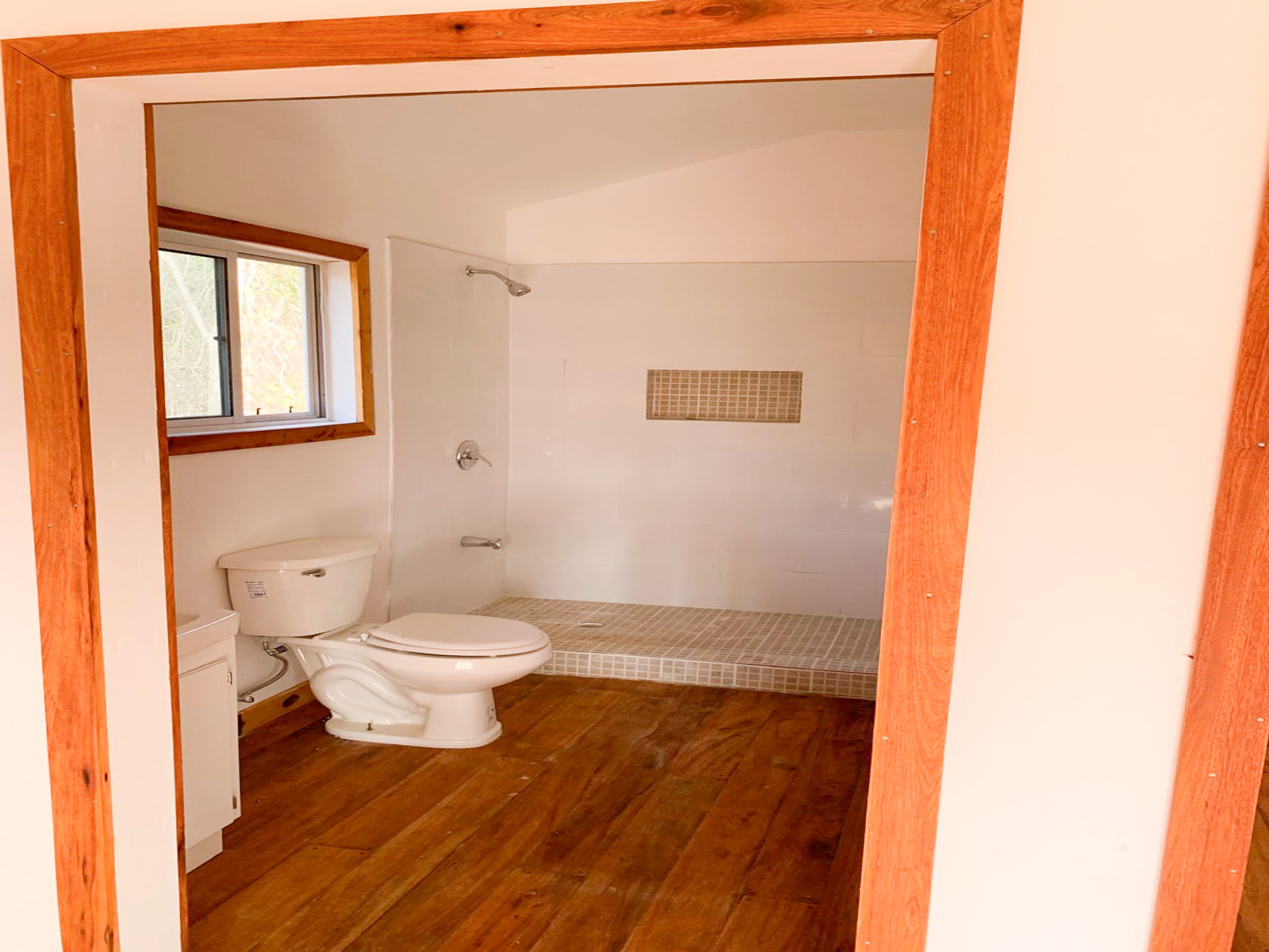 The larger home offers 520ft2 of living space which comprises two bedrooms, one bathroom, an open-concept living and dining area, a kitchen, and a large screened-in deck with a surface of 180ft2. The house is elevated 11 feet off the ground and sits on concrete stilts.