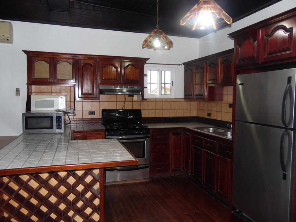 The home is a concrete house but consist of beautiful stained wooden floors and wooden ceiling. Upon entering the home one would enter into a small foyer, that then enters into a large open dining, kitchen and living room that is air conditioned. The dining room consist of a wooden dining table with 6 chairs, whereas the kitchen is equipped with a microwave, fridge, and stove. The kitchen has beautiful stained Mahogany cabinets and a small breakfast bar table for 2. There is a living room area that has a 3 piece couch set and is air conditioned. There is a laundry room behind the kitchen that has its washer and dryer.