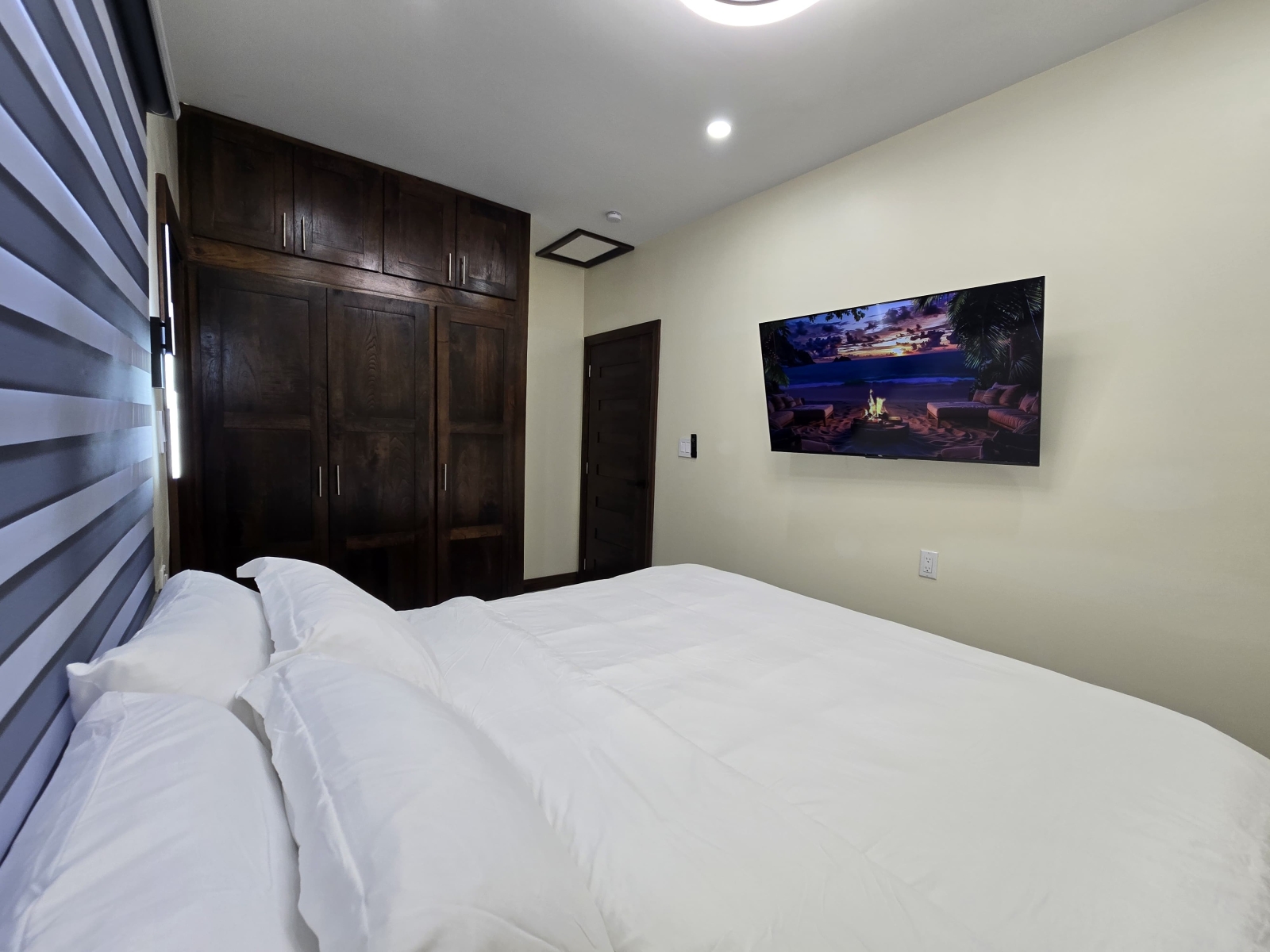 The master bedroom is furnished with a king-sized bed and a small desk area for those who work from home. Additionally, this room features a built-in closet for ample clothing storage. There is a small laundry area equipped with a washer and dryer. It is also furnished with air conditioning for your comfort perfect home for your family.