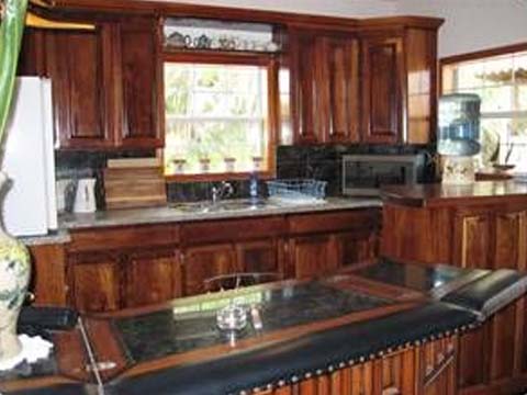 Lower beach level is a studio apartment which can be rented, guest or office space with custom rosewood kitchen and large Jacuzzi, spa bath. Granite counters in kitchen and mahogany vanity in bath. Stained concrete floor throughout the studio . French doors open to outdoor patio area with pergola, outdoor rain water shower and custom concrete BBQ grill, stamped concrete throughout verandah.