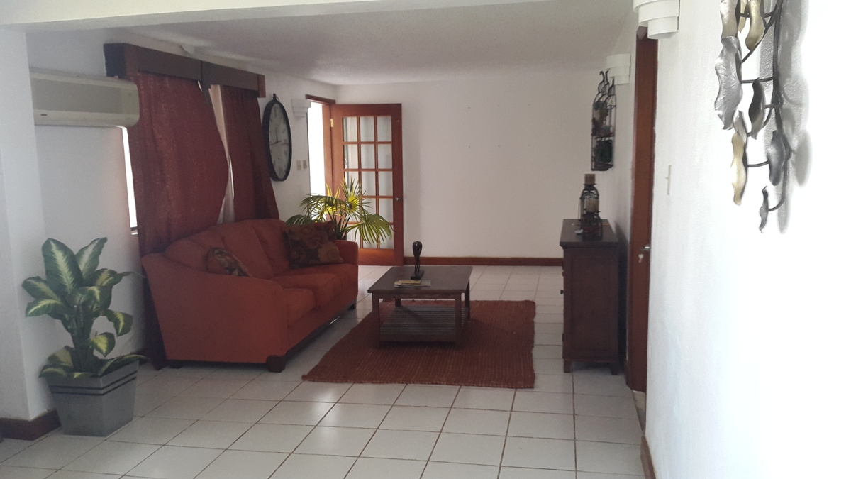 The upper floor consists of an open dining and living room area along with a sitting area, a closed kitchen and 2 large bedrooms with their own bathrooms. The living room has beautiful wooden floors and lighting giving it an elegant, professional look. To top it off, this living room has access, through some sliding glass doors, to a large veranda overlooking the beautiful Caribbean Sea horizon. These glass doors allow the refreshing and cool sea breeze to engulf the entire upper floor ensuring cool temperatures. The master bedroom is spacious and is equipped with a queen sized bed (can fit a king) and is facing the Caribbean Sea. This bedroom also has access to its private, en suite bathroom. The other bedroom is also spacious also having a queen sized bed and though it isn’t an en-suite bathroom, the bedroom still has a direct door to it.