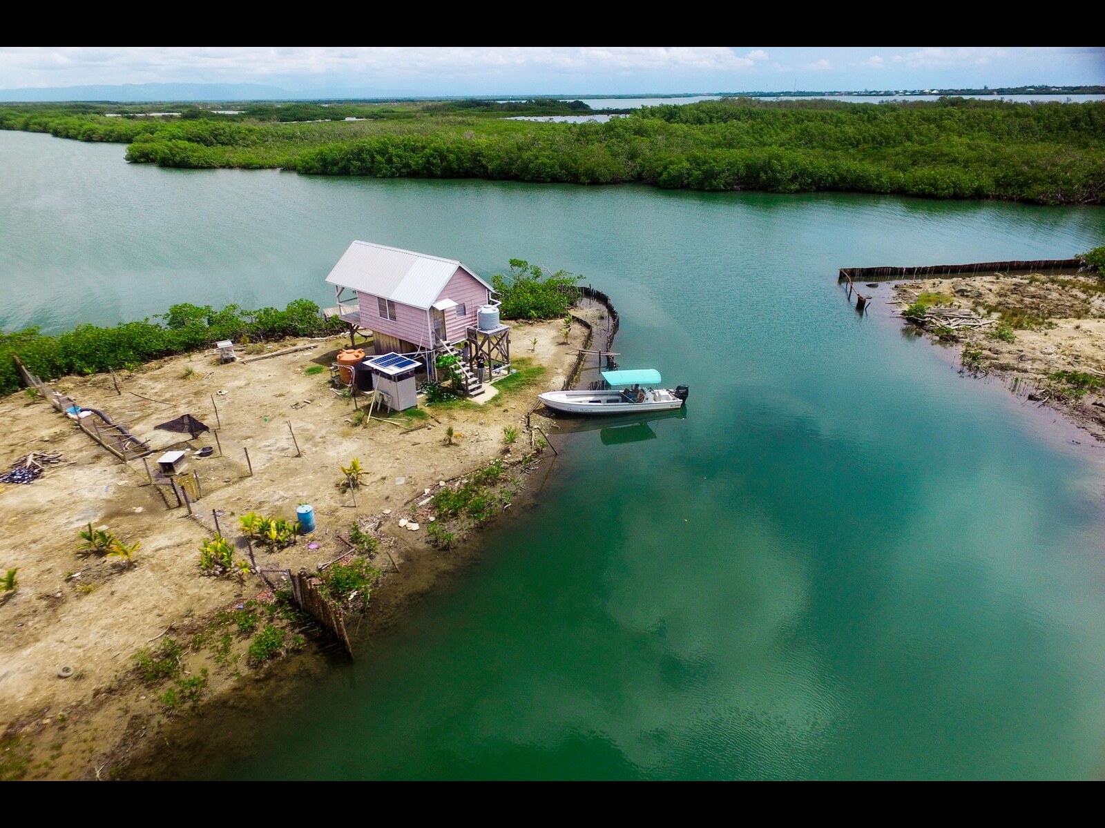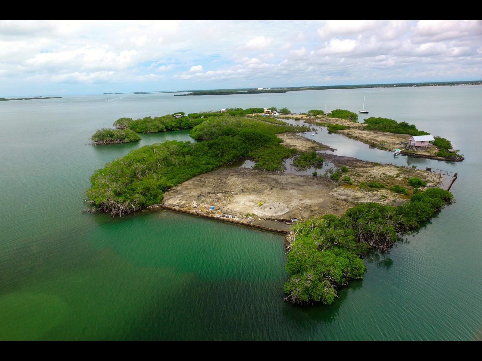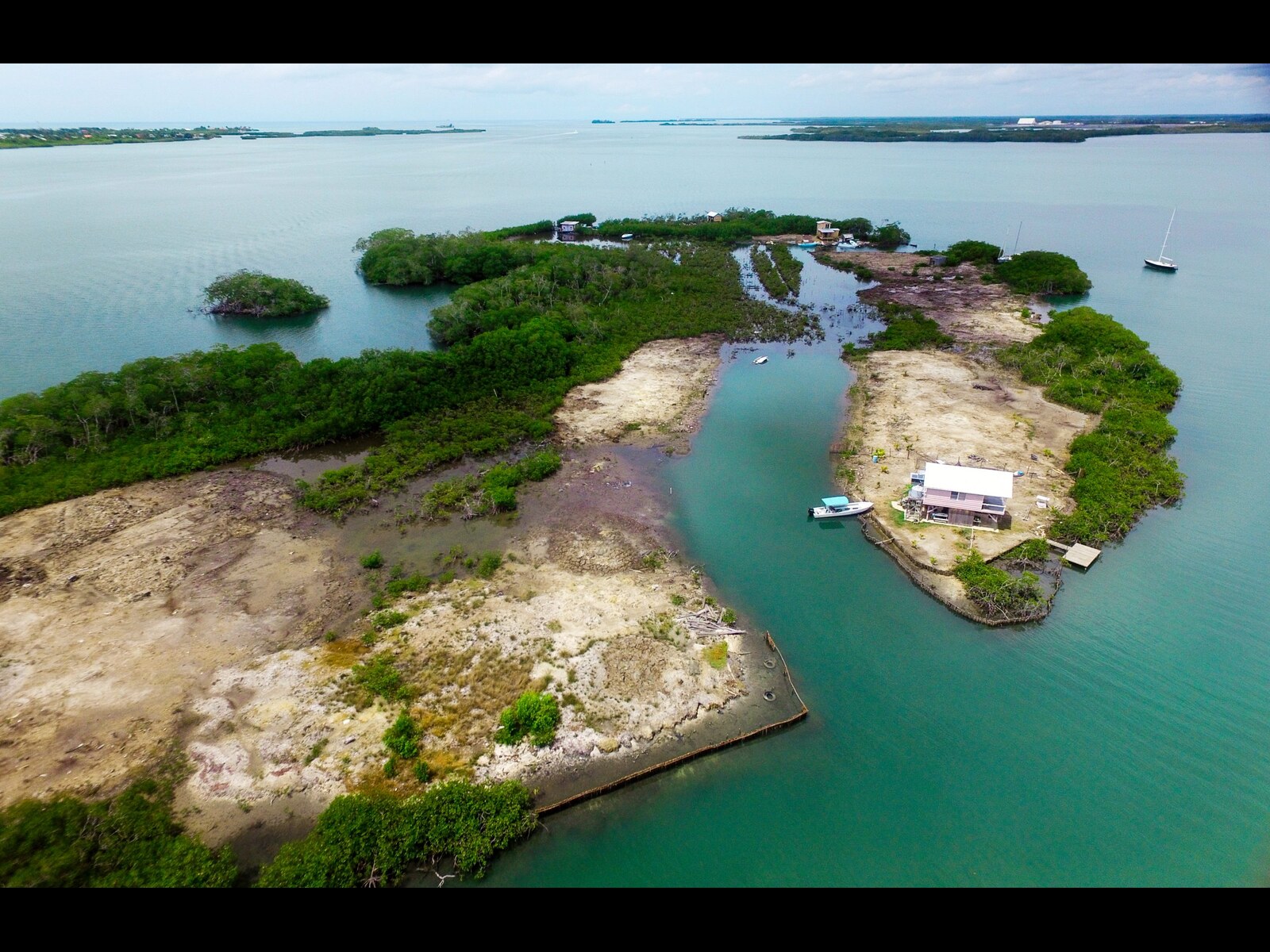 The land has been mostly filled to approximately two feet above sea level, providing a strong foundation for future development. Included in the sale is a charming one-bedroom wooden home situated along the southern boundary, as well as an 18-foot fiberglass skiff with engine—offering immediate access to the surrounding waterways.