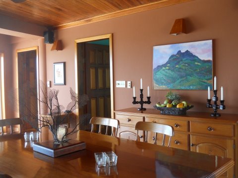 The second level has two covered verandahs; one faces the sea and the other overlooks the gardens and fruit orchard looking westward. This verandah is a favorite for both breakfasts and dinners at the outdoor eight place dining set.