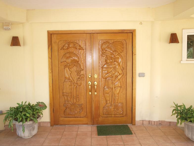 The ground floor is accessed from the drive-through, covered, Porte Cochere, through double wide, thick mahogany doors each hand carved with the life sized impression of a Maya King and Princess. The views seaward, from the foyer, through the 20 foot wide front sliding doors are breathtaking. This level also contains a covered verandah, a favorite place for "hammock time".