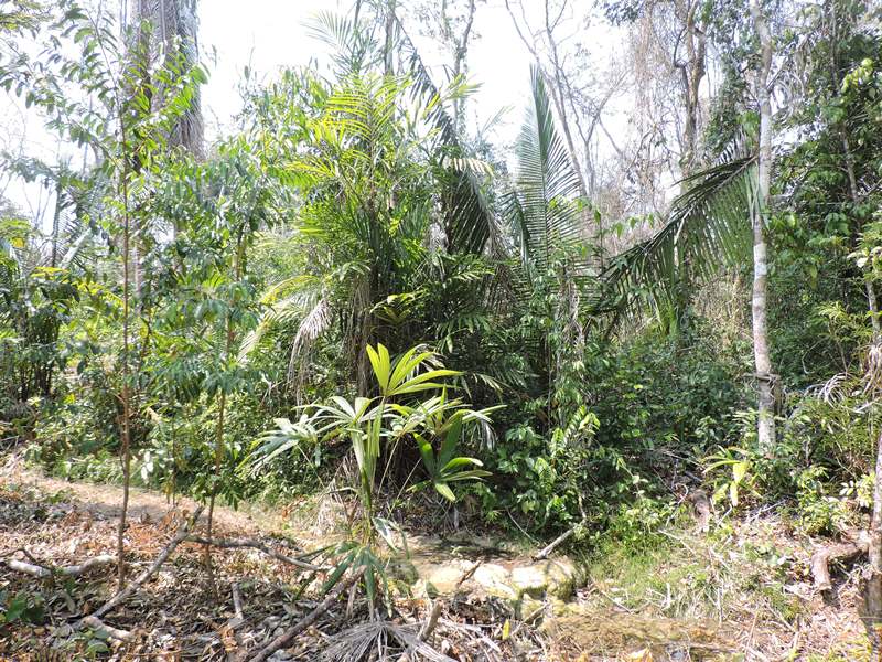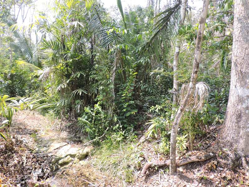 The lot is currently in its natural state—with tall grass and thick bushes and large trees. There is a small pathway that winds through the property into the thick foliage of greenery. There is also a small spring of water that runs through about halfway of the land.