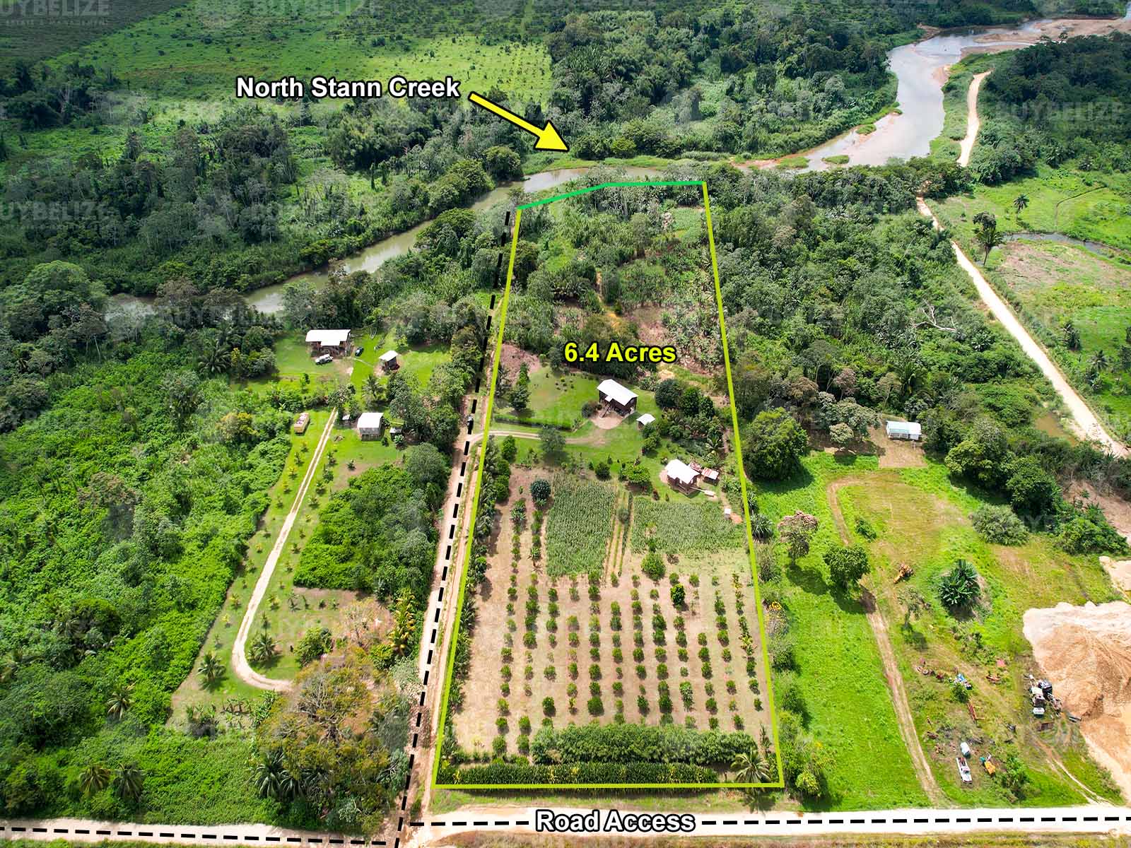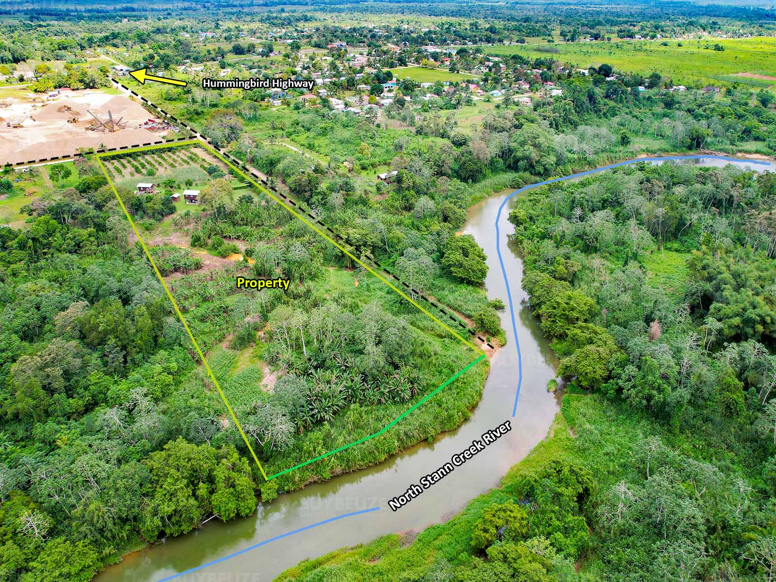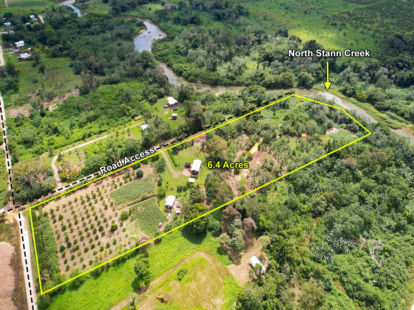 One of the property's most unique features is the impressive 4 acres situated on a high plain, which affords breathtaking panoramic views of the majestic mountains and the winding river below. The remaining 2.4 acres gently slope down to the riverfront, where a charming small stream meanders through the land, perfect residence in Stann-Creek.
