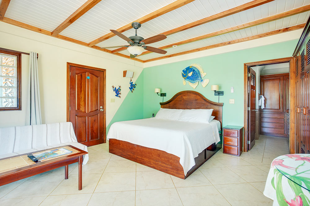 This second-floor room has an orthopedic king bed and a futon, with a glass door that opens to a veranda overlooking the sea. There is also a “suite option” (see below) in which the adjoining kitchen & living room is opened up and becomes part of the room.