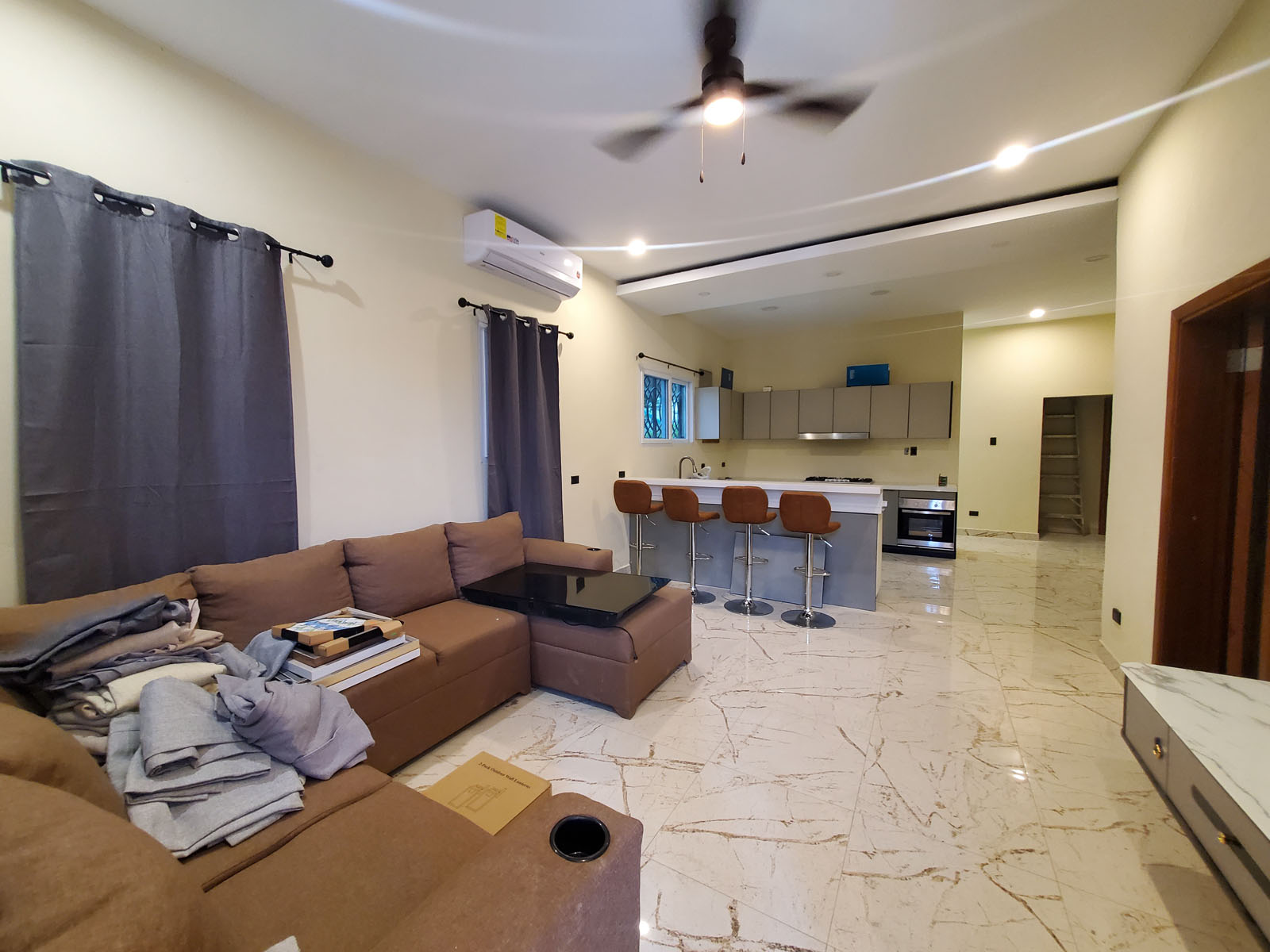 Welcome to this fully furnished contemporary home located in a quiet residential area of Belmopan City, just 5 minutes from downtown. Featuring 3 bedrooms and 2 bathrooms, this home offers an open-concept living, dining, and kitchen space perfect for modern living. The kitchen boasts sleek cabinets, and all rooms are equipped with air conditioning units for year-round comfort. Two of the bedrooms come with private ensuite bathrooms, while the third bedroom can be used as an office or additional living space. Step outside to the beautifully landscaped backyard, complete with a pergola, ideal for outdoor dining or family cookouts. The property sits on a fully fenced lot with an automated gate for added security and convenience. Don't miss this excellent rental opportunity in a prime location!