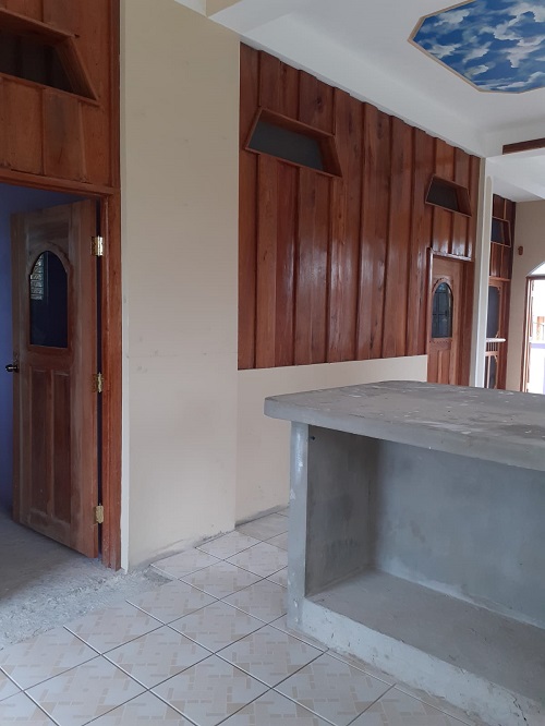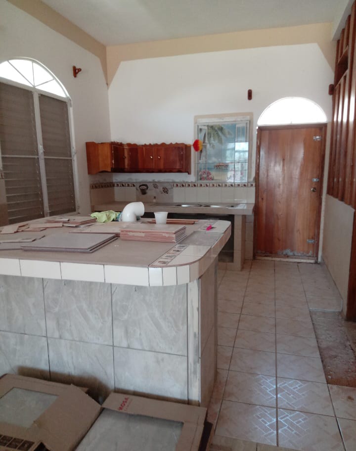 Fully Tiled Kitchen – Beautiful handcrafted cabinets made from rich Belizean hardwood