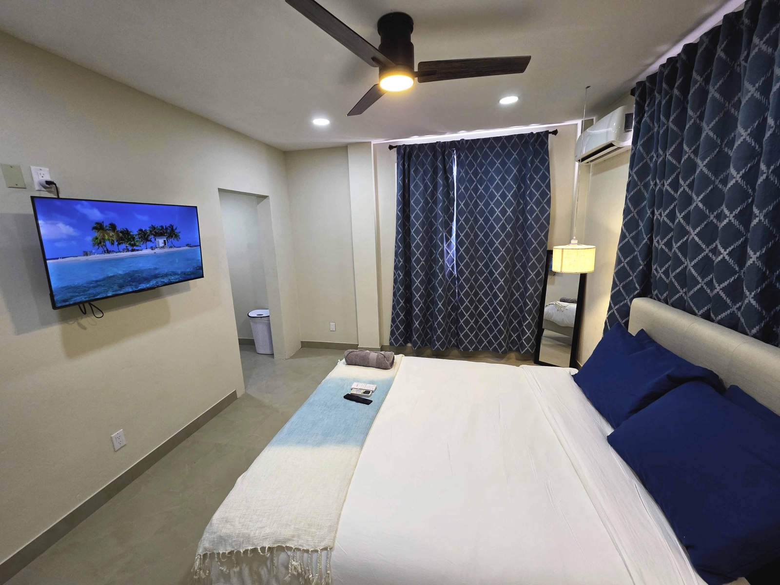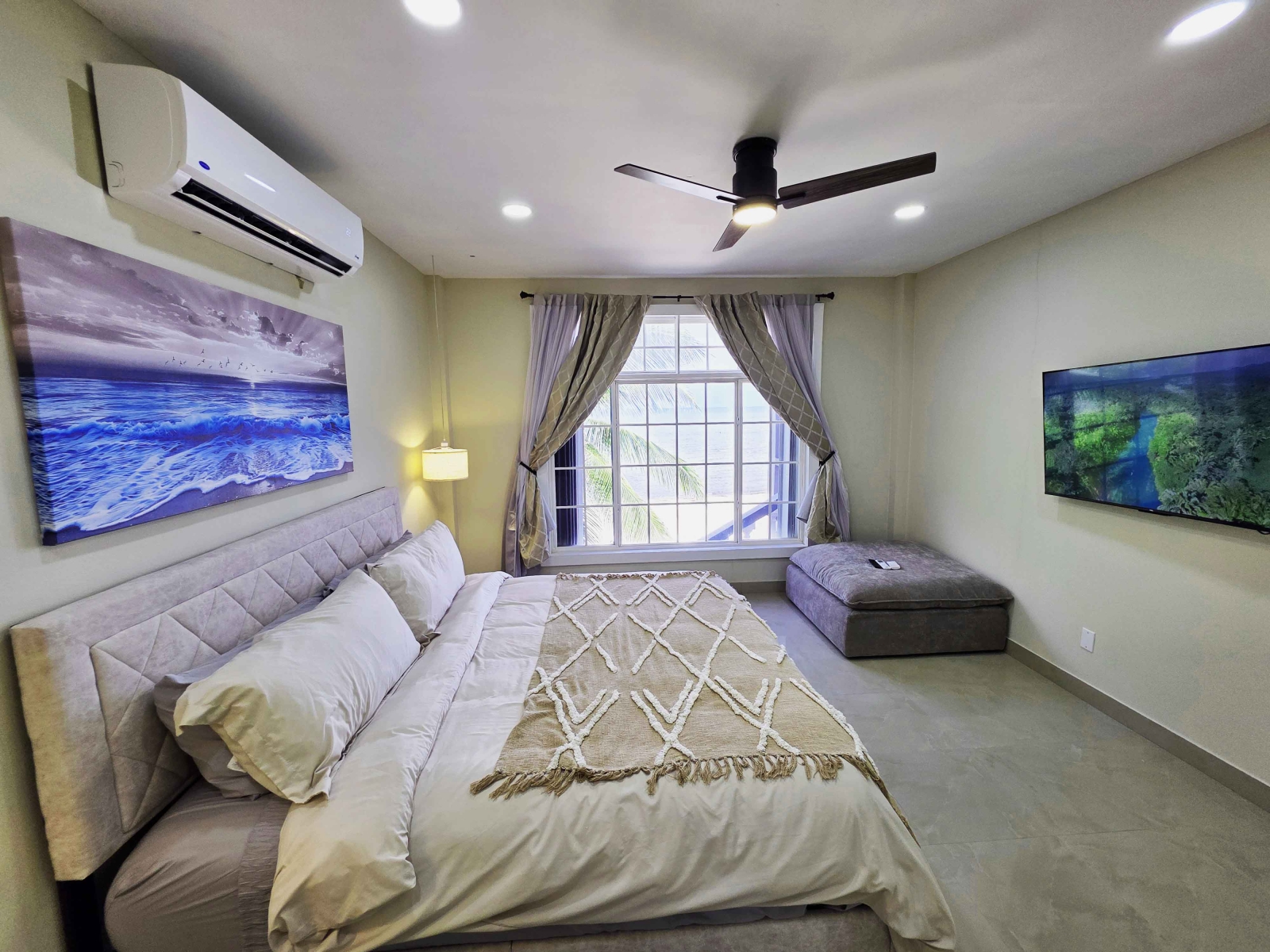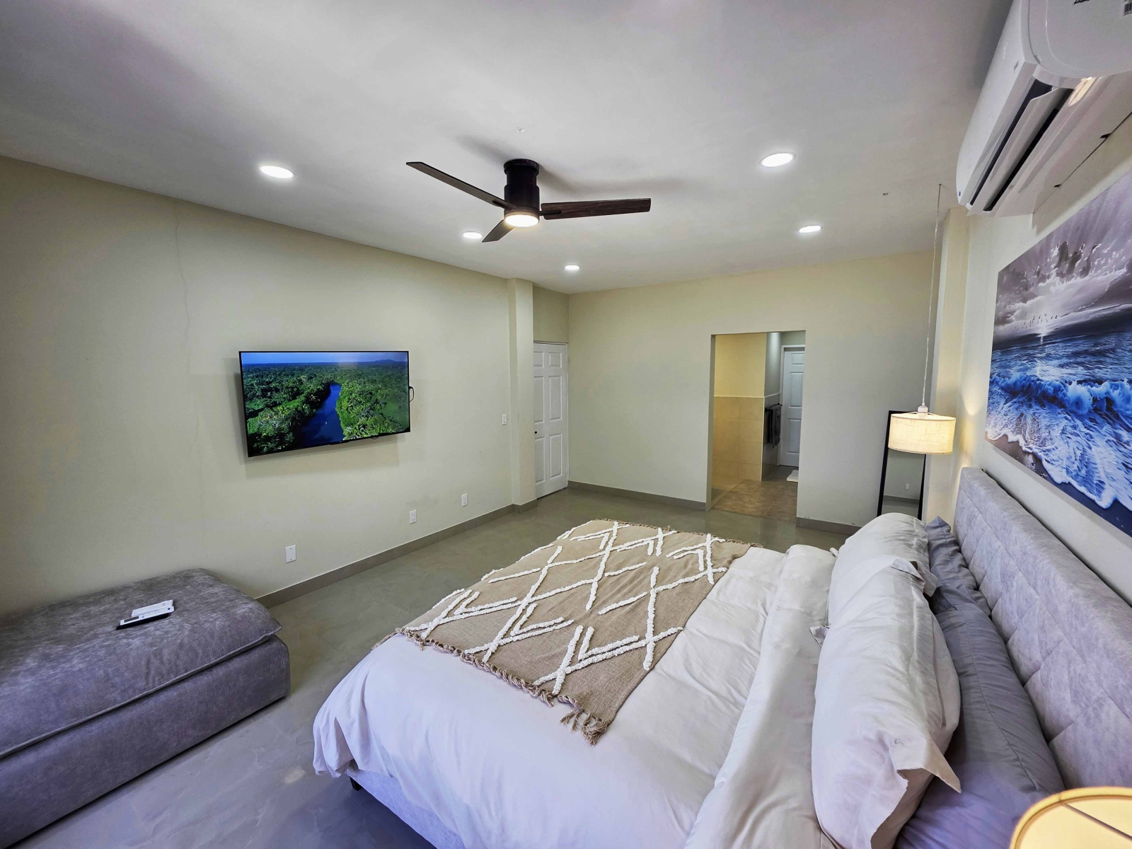 The master bedroom offers a serene retreat with a luxurious king-size bed, mounted TV, and elegant finishes. Every detail, from the recessed lighting and air conditioning to the soft neutral tones creates a relaxing, upscale atmosphere.