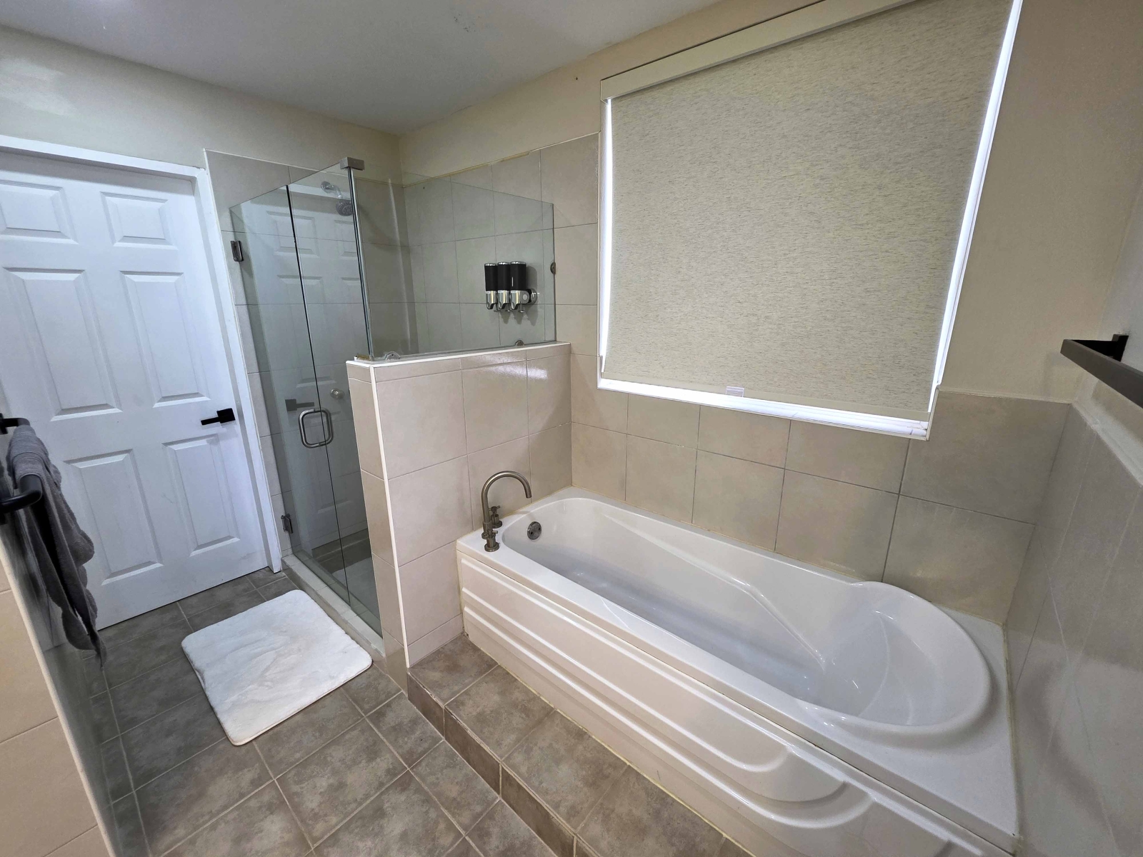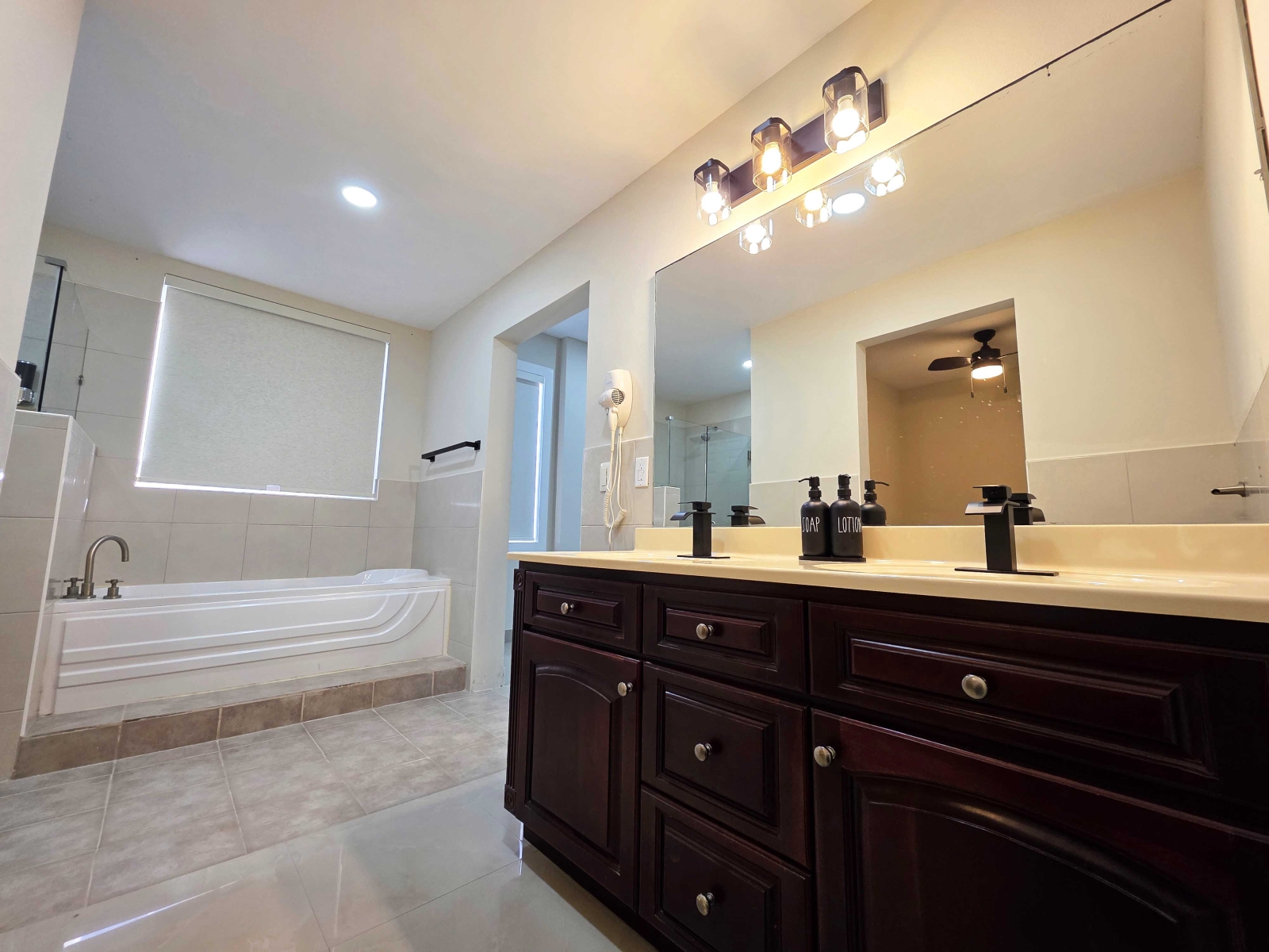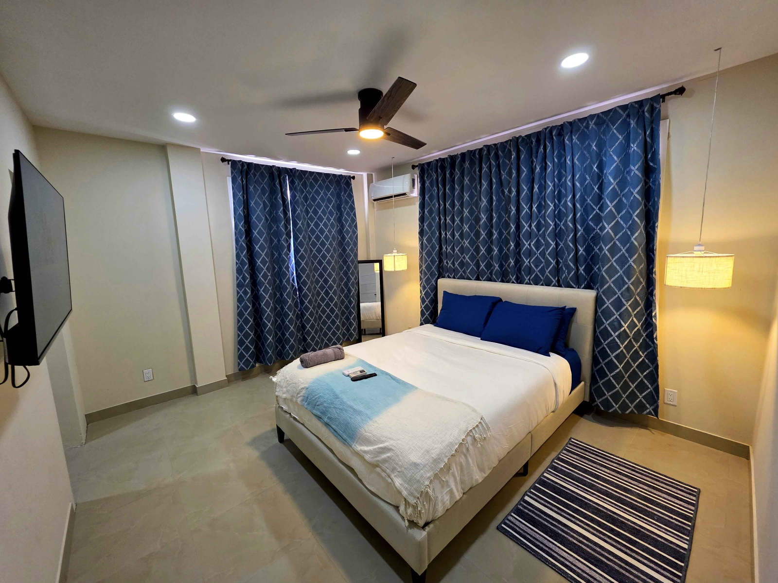 The master bedroom offers a serene retreat with a luxurious king-size bed, mounted TV, and elegant finishes. Every detail, from the recessed lighting and air conditioning to the soft neutral tones creates a relaxing, upscale atmosphere.