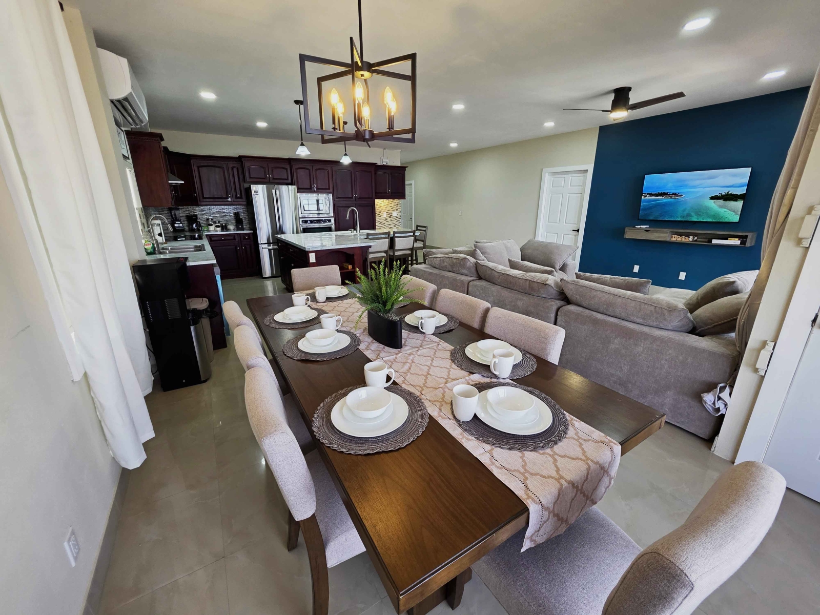 The interior features tasteful modern décor, a spacious living area, and a well equipped kitchen with stainless steel appliances, rich wood cabinetry, and a sleek marble island. The dining area comfortably seats eight, making it perfect for family dining and seating guests.