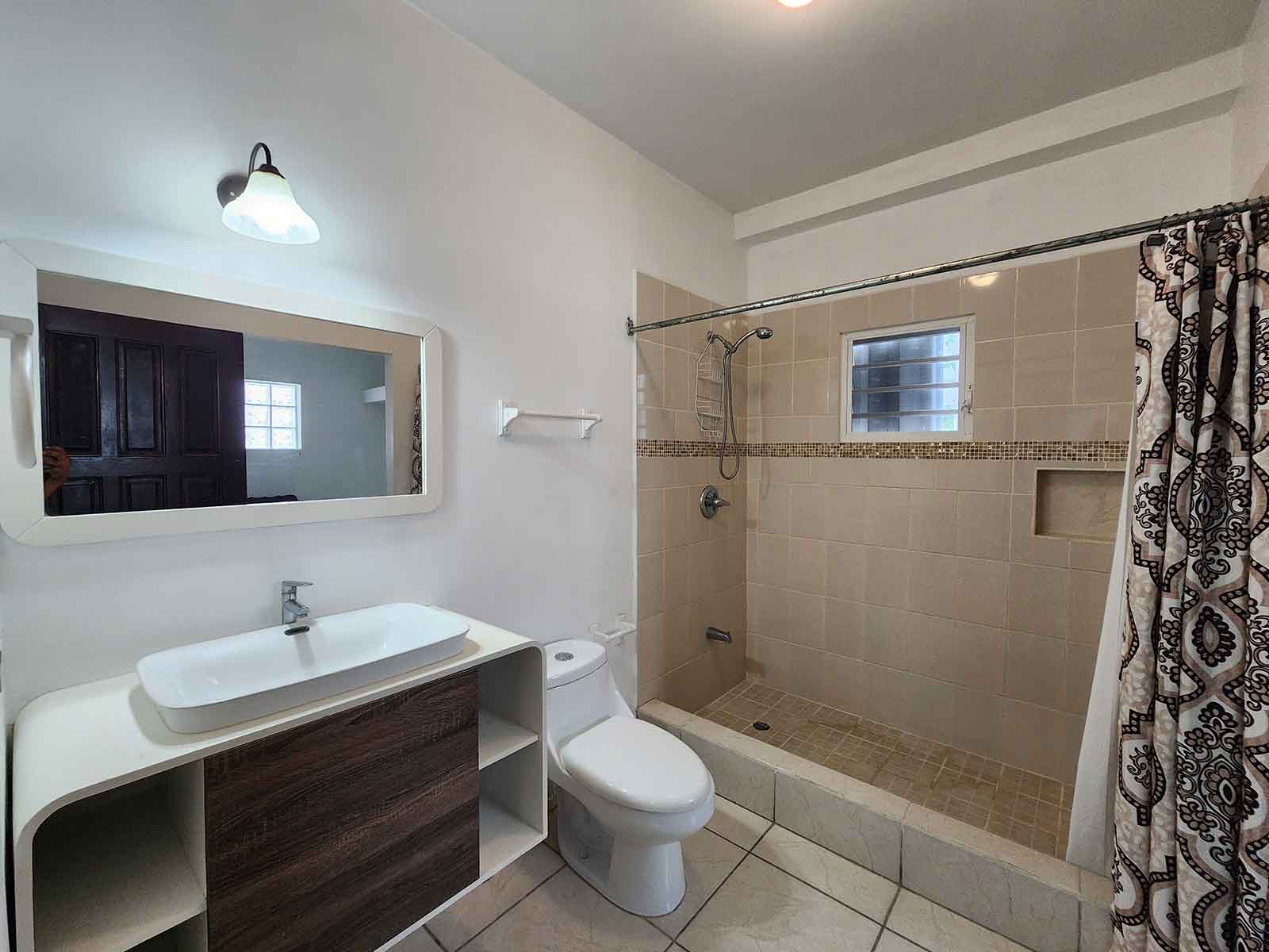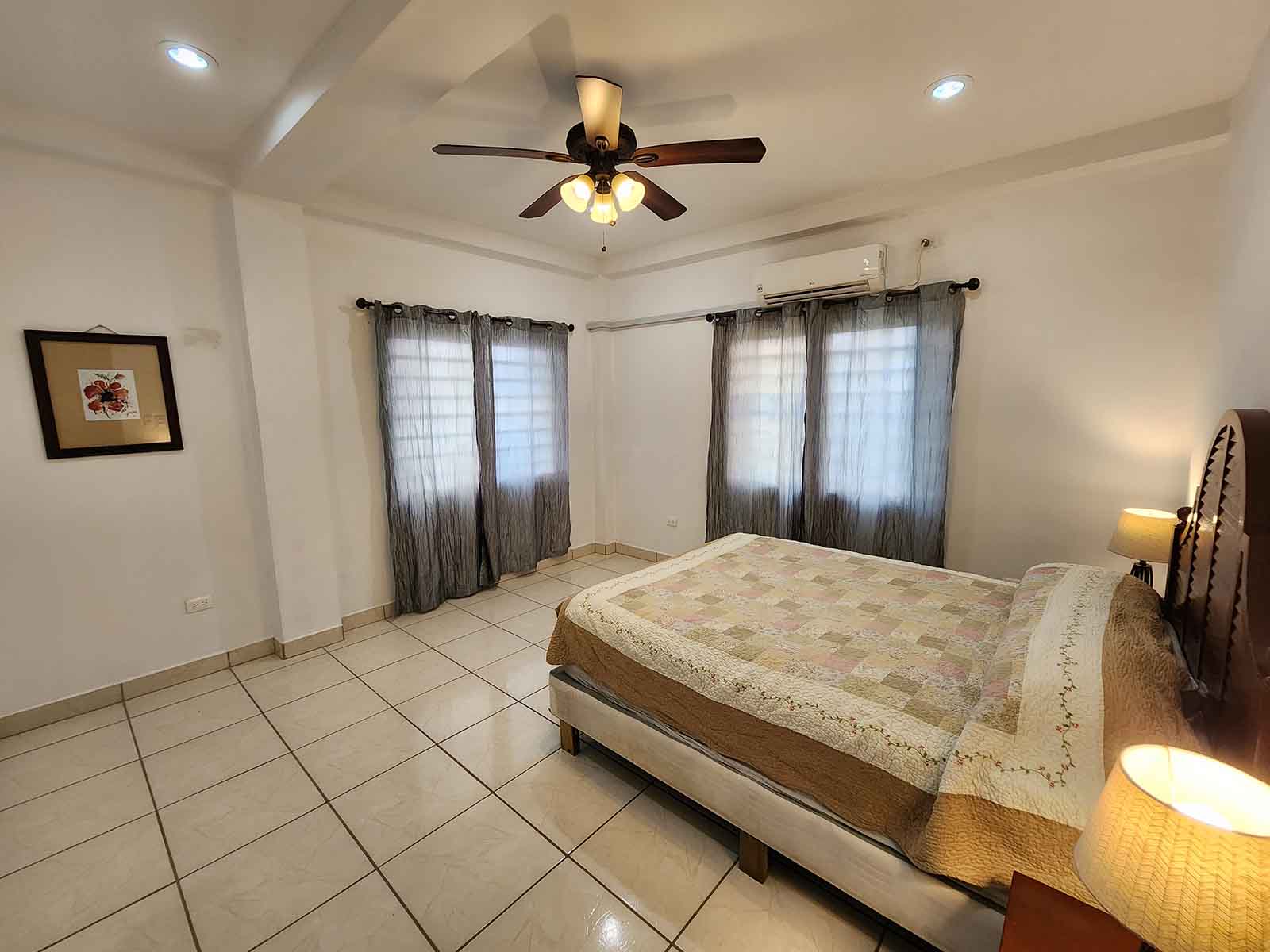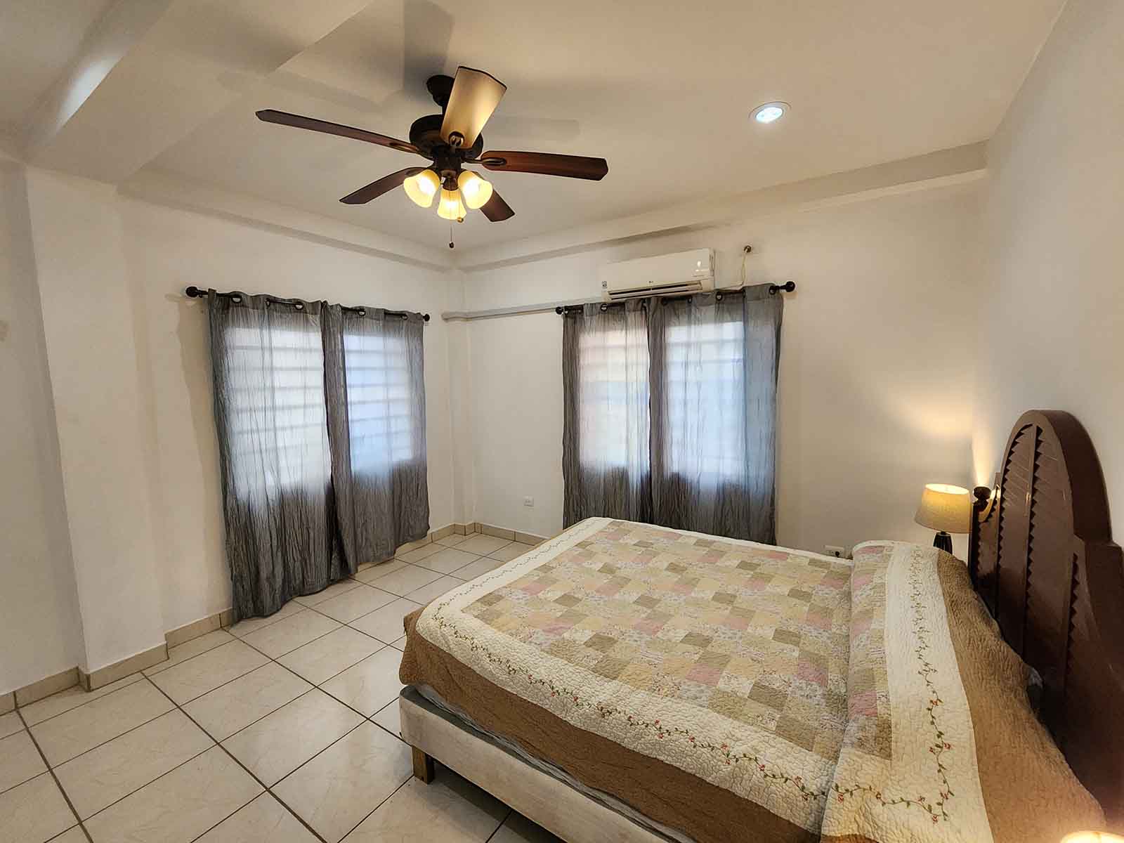 Down the corridor there is the shared bathroom and across from it there is the guest bedroom. The guest bedroom is furnished with a queen size bed with a split AC unit and has a built-in closet space. The master bedroom is spacious with a large bed, AC unit and access to a private bathroom with a large walk in closet. Also, you would have access to the roof top that gives amazing views of sun sets.