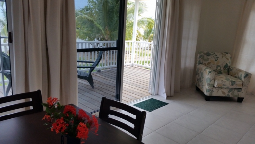 This is a beautiful fully furnished 1 Bedroom 1 Bathroom home located on the beach in Hopkins Village. The home is elevated about 8 ft above the ground and has stunning views of the Caribbean Sea from the 160 sq ft outside deck. The deck is equipped with a coffee table and two outside chairs. From the outside deck one would enter into the open dining, kitchen and living room. The living room is equipped with a 4 piece couch set while the dining room has a 4 seater dining table. The kitchen is fully equipped with a fridge, stove, pots, pans, cups, plates, kettle, and toaster.