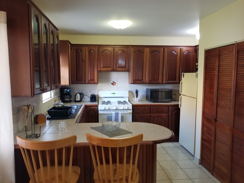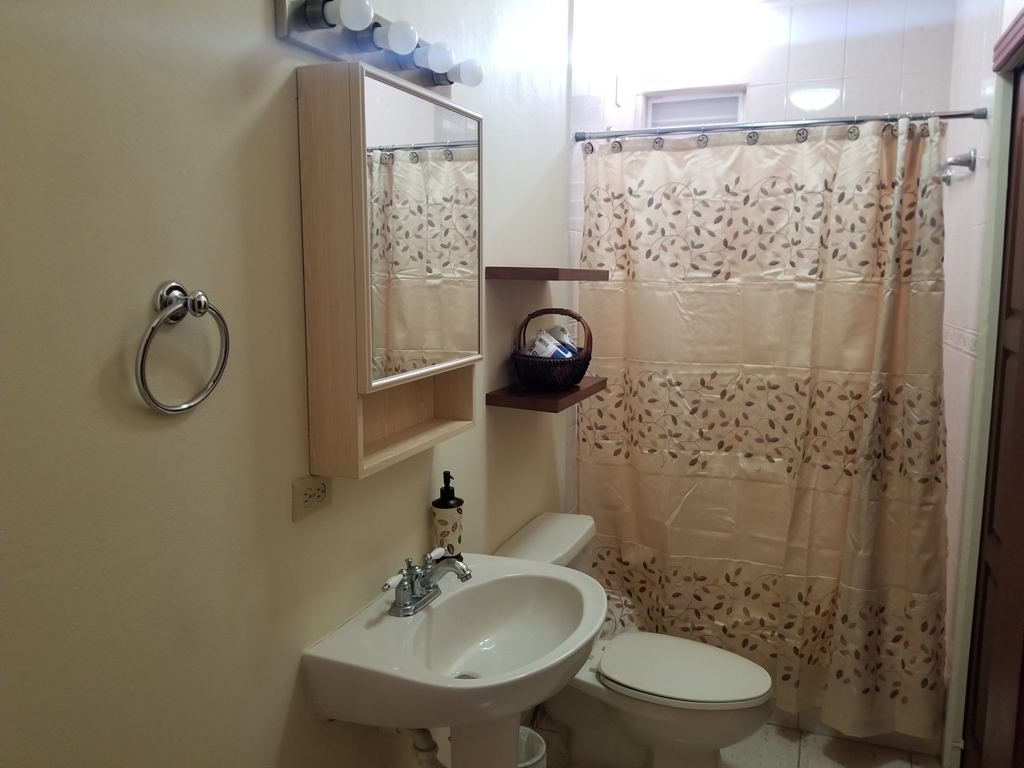Upon entrance of the apartment one enters an open dining, kitchen and living room. The living room is air conditioned and has a 2-seater couch along with a 42-inch flat screen T.V. The kitchen is spacious in which it comes fully equipped with stove, fridge, microwave, coffee maker and a stackable washer & dryer. The kitchen has breakfast bar that seats 2 however, there is still a 4-seater dining table. A small hallway leads to the bedroom and bathroom. The bedroom is air conditioned and has a queen size bed along with a sizeable closet. The bedroom does have direct access to the bathroom and contains an emergency exit.