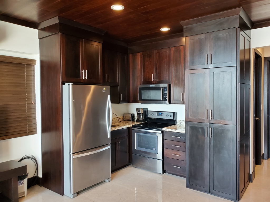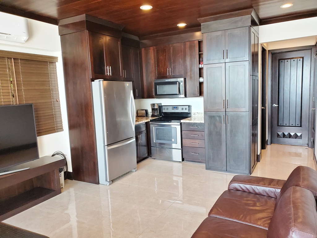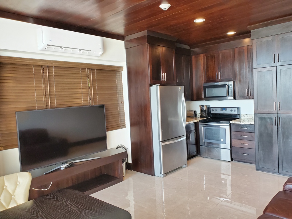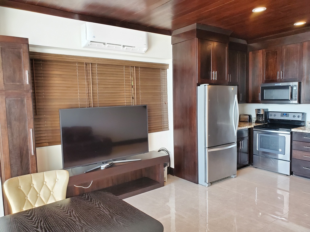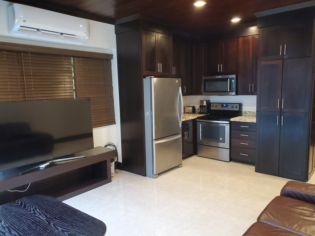 Upon entrance to the apartment one enters an open dining, kitchen and living room. The kitchen is fully equipped with stainless steel appliances, Fridge, Stove, Microwave, Toaster, Blender, Coffee Maker along with cutlery, pots, pans, plates, and cups. There is a stackable washer and dryer in a cabinet within the kitchen area. The living, dining and kitchen area is air conditioned.