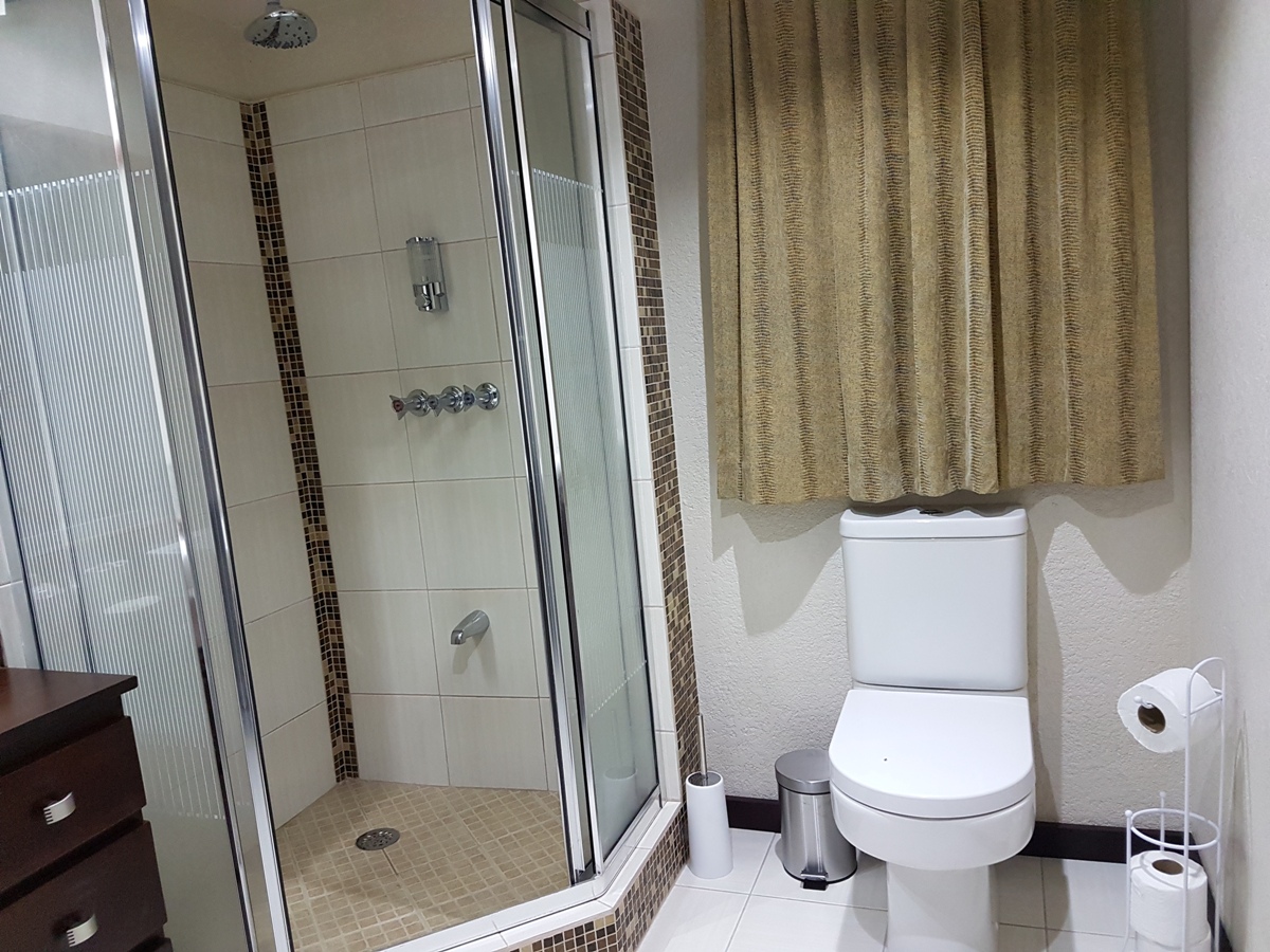 The guest bedroom has a double bed whereas the Master Bedroom has a Queen size bed. In the middle of the two rooms is the bathroom that has a standing shower with hot and cold shower. The apartment has a stack washer and dryer.