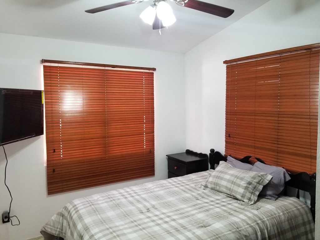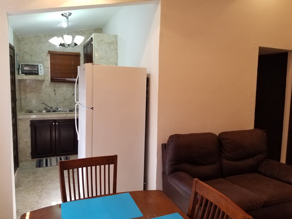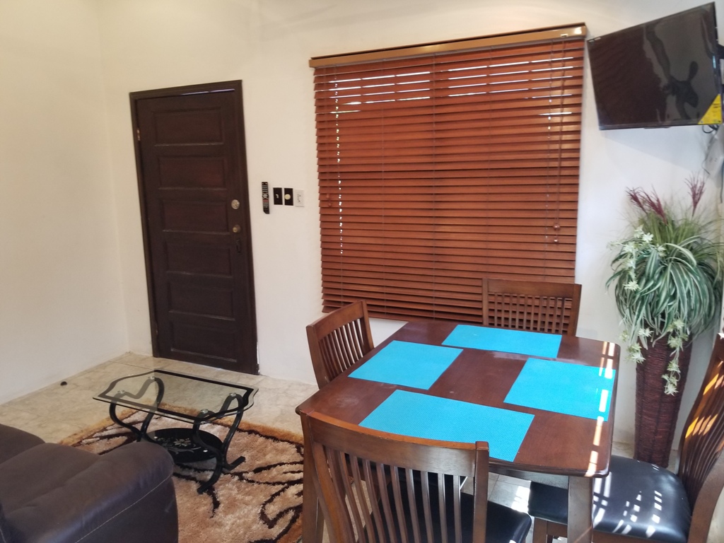 Upon entrance one enters a cozy open dining, kitchen and living room. The area consists of a single couch, 4-seater dining room, flat screen T.V, Stove, Fridge, Microwave, Toaster Oven, Coffee Maker and other utensils. The first bedroom consists of a double bed along with a walk-in closet. The 2nd bedroom consist of a queen bed along with a closet space which holds the washer and dryer. This bedroom is air conditioned. The bathroom is spacious enough and has access to hot and cold shower.
