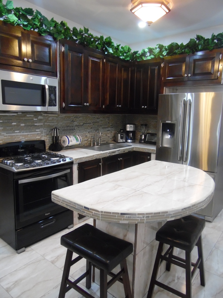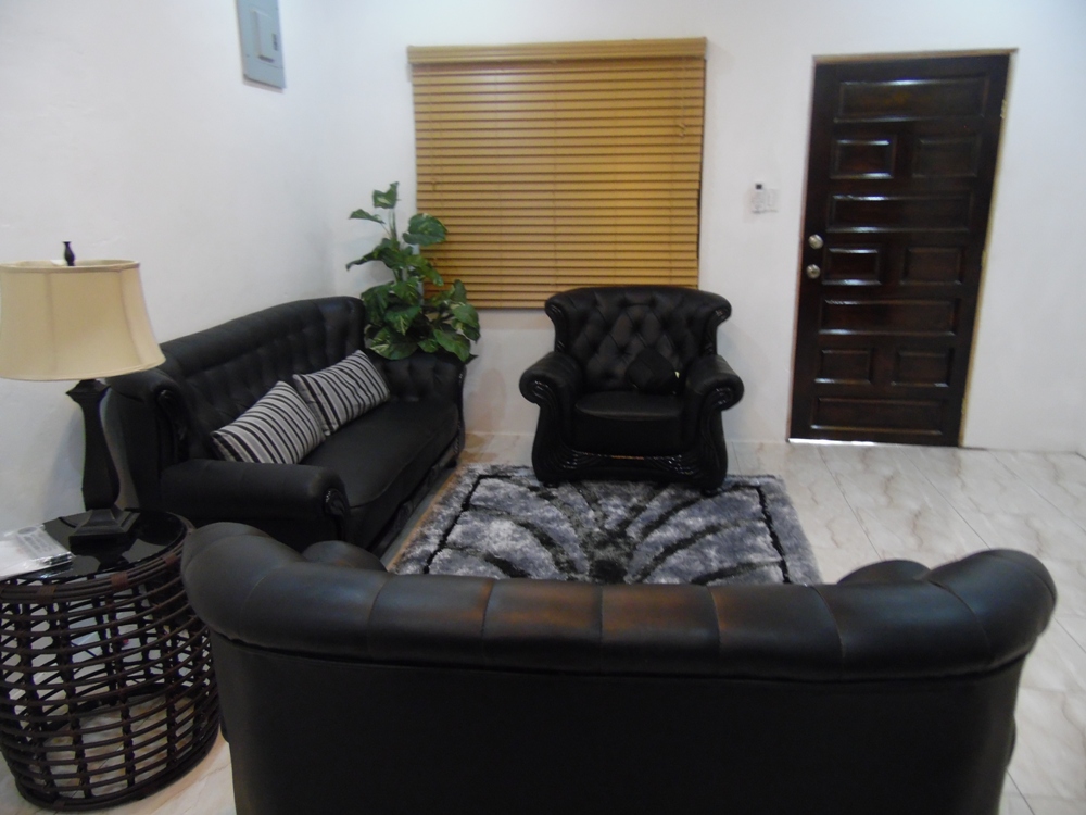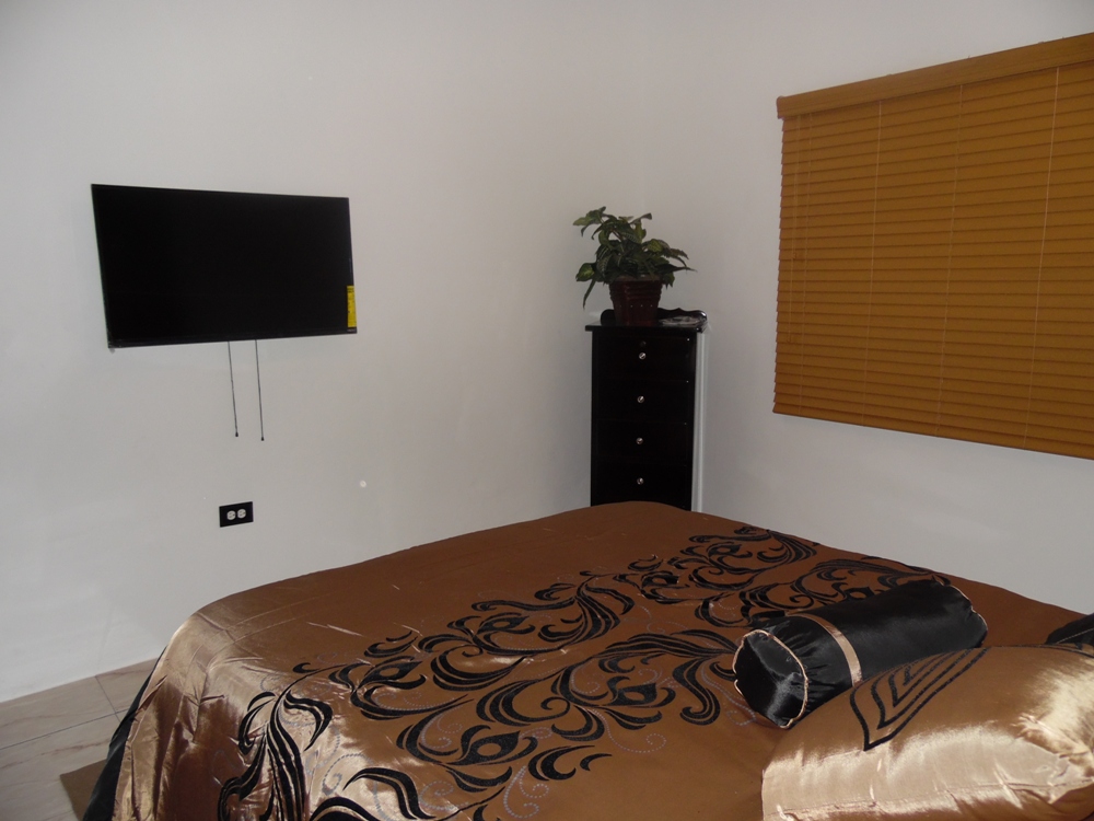 This is a beautiful and modern Fully Furnished 2 Bed 1 Bath apartment located in Ladyville. The apartment has an open dining kitchen and living room. The living room is equipped with a 3 seater couch set with a mounted flat screen T.V. The kitchen is concrete with tiled counter top and a Mahogany Cabinet finished. The kitchen area also has access to a breakfast bar. The kitchen is fully equipped with a fridge, stove, microwave hood, toaster oven, blender, coffee maker, toaster and other kitchen appliances. The kitchen dining living is air conditioned.