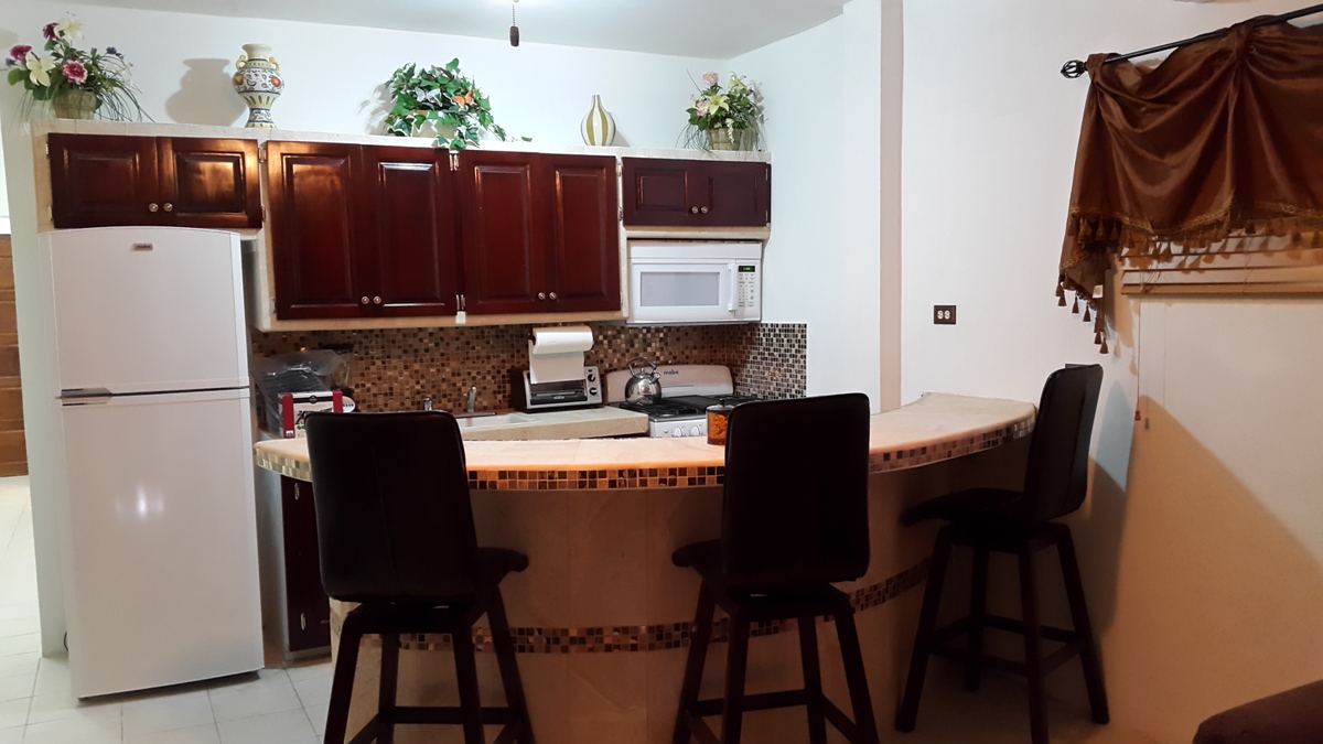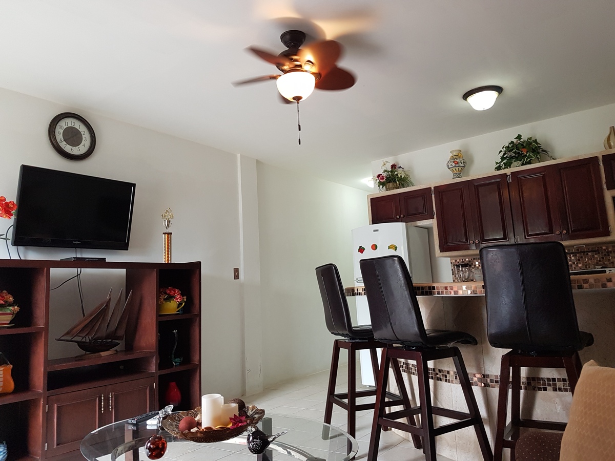 This beautiful apartment offers approximately 600 sq. ft. of living space and can comfortably fit a family of 4. The apartment has an open kitchen and living room. The living room has a comfortably brown couch that faces a 32 inch flat screen television which is equipped with a DVD player. The kitchen has beautiful tiled counters and dark wood cabinetry. It’s equipped with a large, concrete and tiled breakfast table with 3 tall and comfortably bar stools.