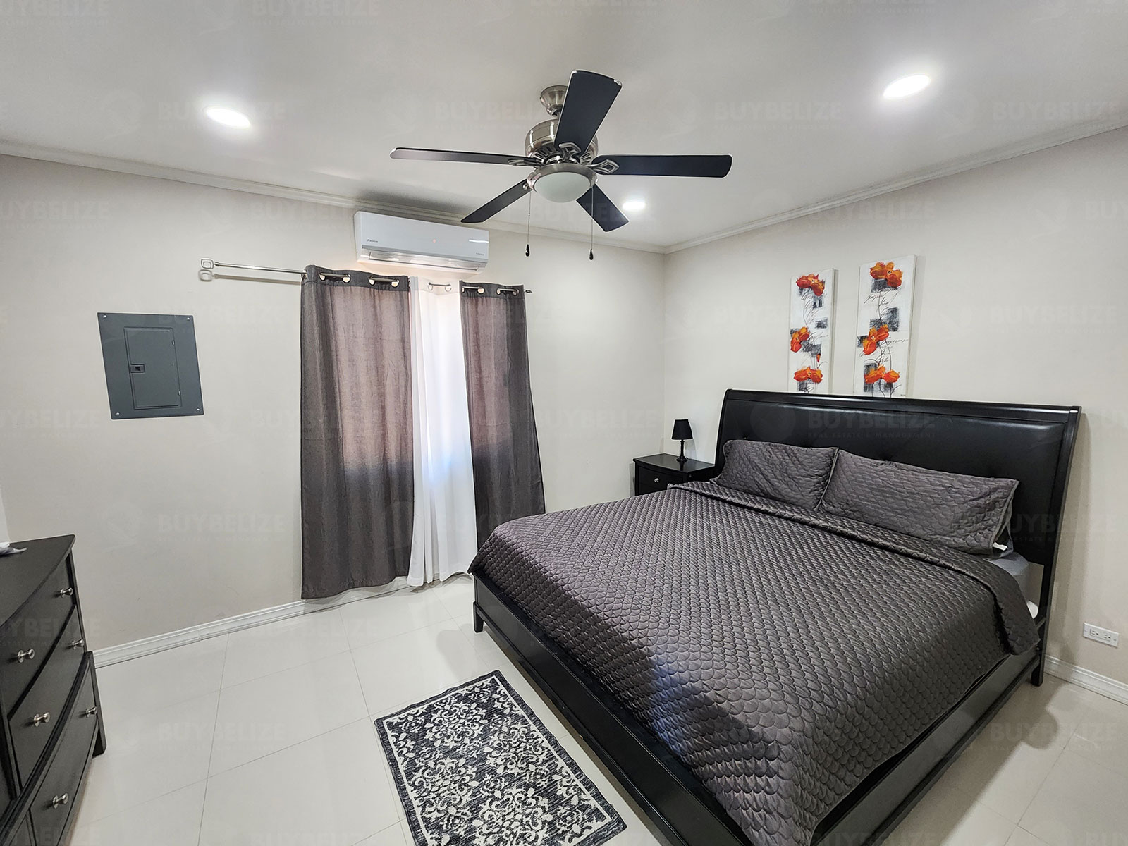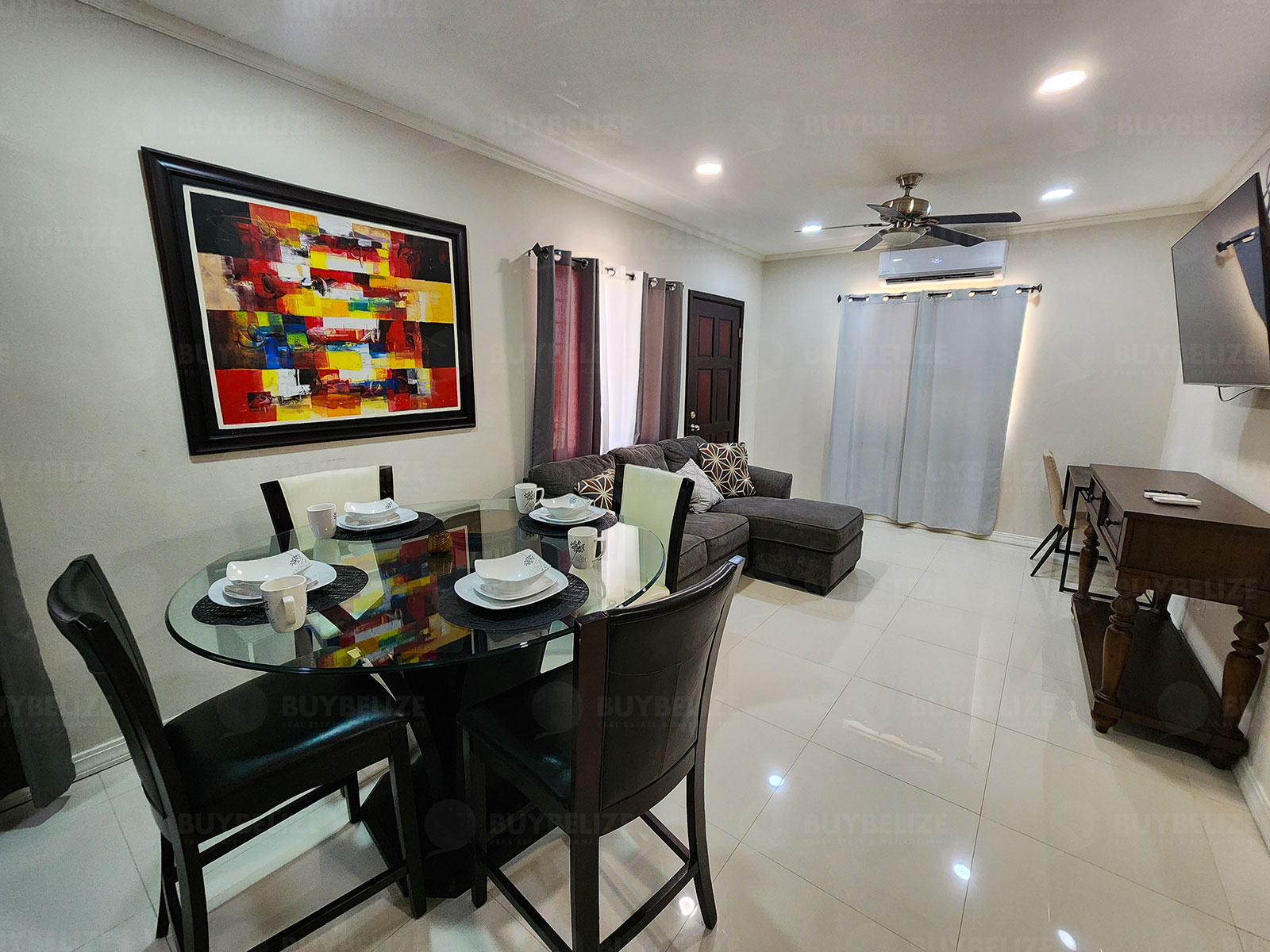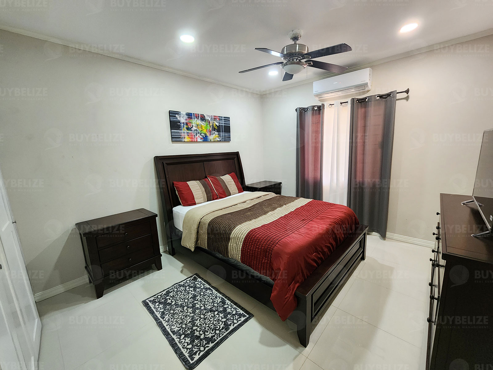 This modern apartment is fully tiled and air conditioned. The dining room is furnished with a four seater glass top dining table, and the living room includes a stylish couch. The kitchen is equipped with mahogany cabinets and finished with granite countertop and stainless steel appliances. The laundry area is loaded with stackable washer and dryer. The master bedroom is furnished with a king size bed and nightstands, while the second bedroom is fitted with a queen size bed and nightstands.