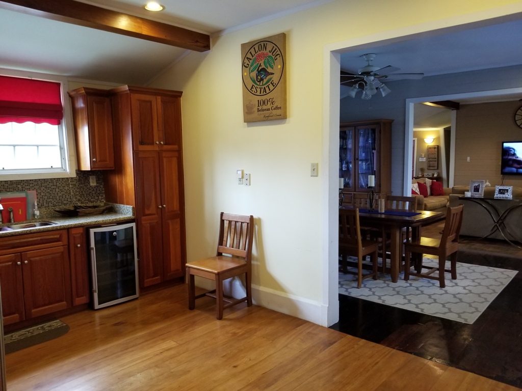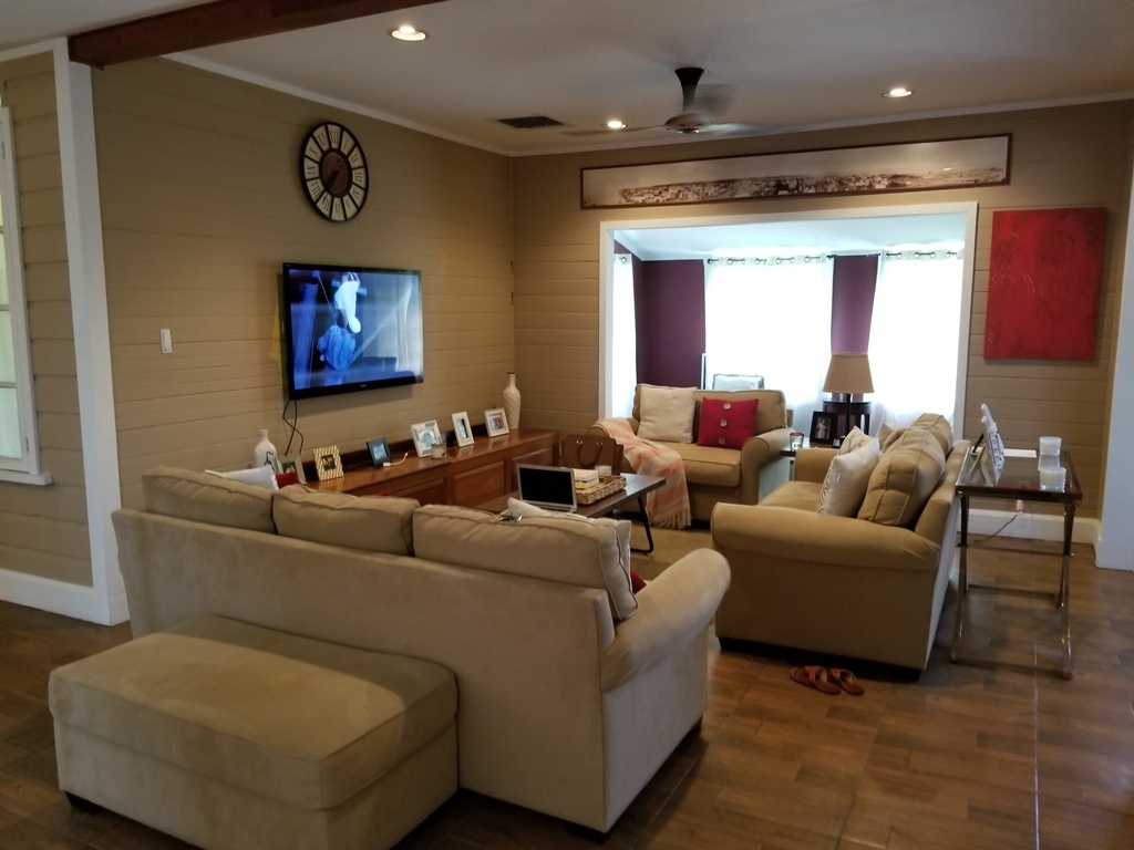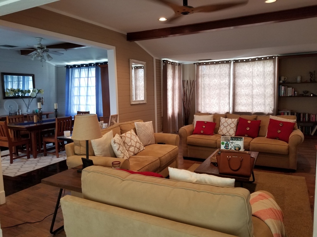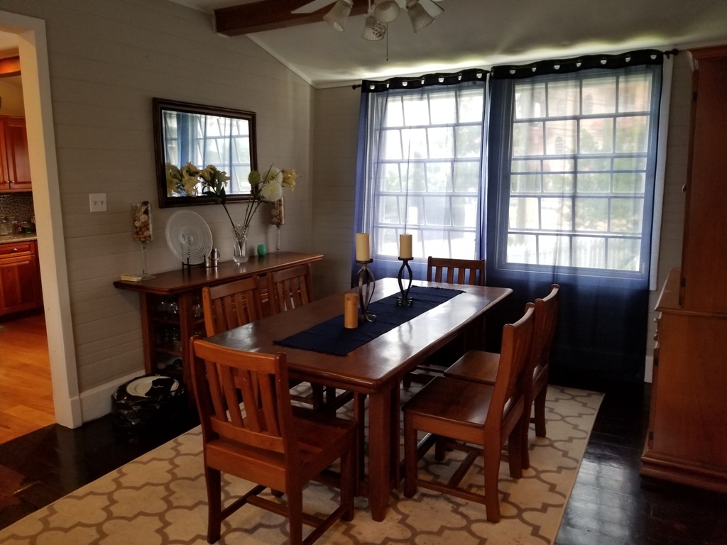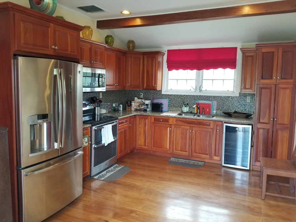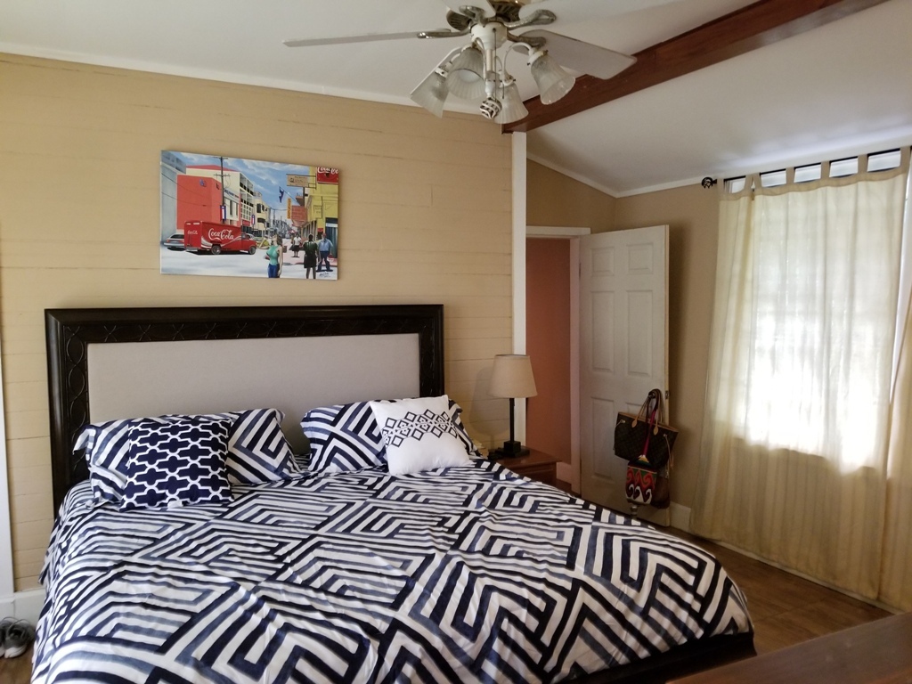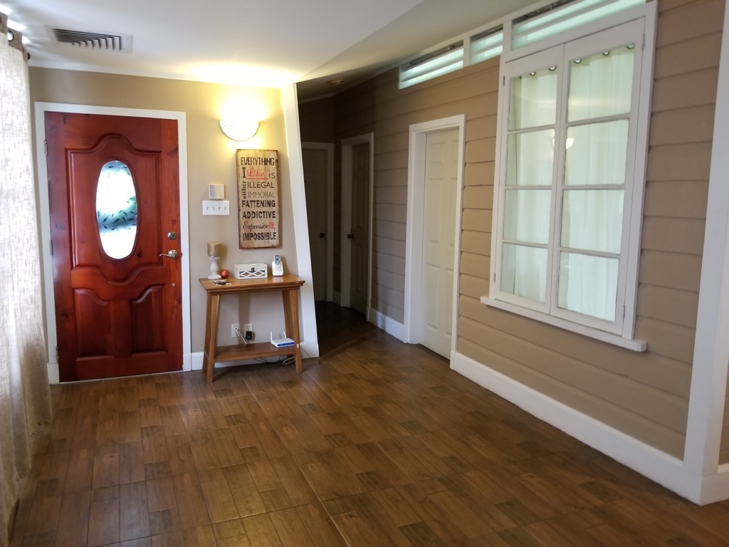 Upon entrance of the home there is a hallway walkway in which to the left leads to the bedrooms & bathrooms and to the right leads to the rest of the house. Going to the right the home has a semi open dining, kitchen and living room. Behind the kitchen is a laundry room that is equipped with a washer and dryer. The kitchen is large and is any chef’s dream. The kitchen is fully equipped with a large fridge, electric stove and smaller appliances such as microwave, blender, coffee maker etc. The kitchen also has an exit that leads to the back porch that is excellent to have morning breakfast or coffee.