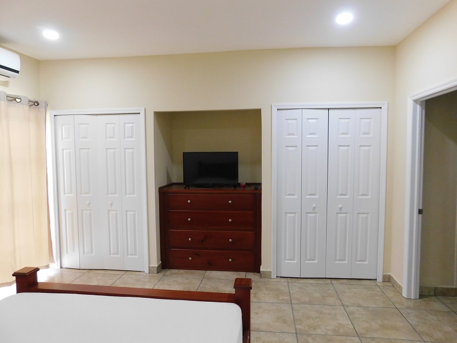 The bedrooms are spacious and furnished with mahogany queen-sized beds, drawers, have ample closet space, and a private bath, with hot and cold water. The bathrooms consist of both hot and cold water. Not to mention, this apartment is equipped with air conditioning units in the rooms. There is a small space that is equipped with a washer and dryer.