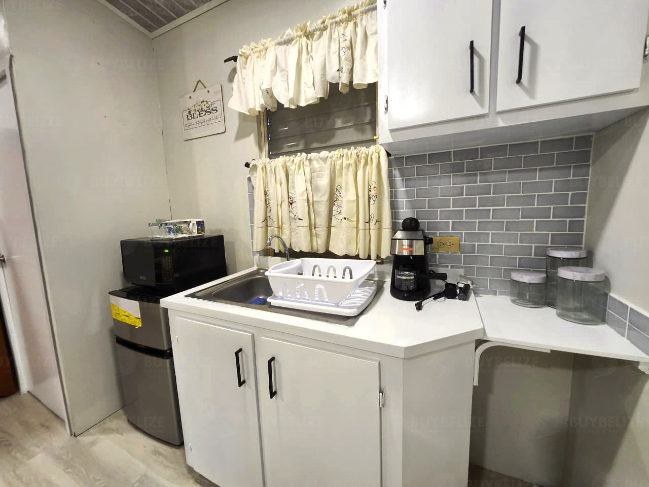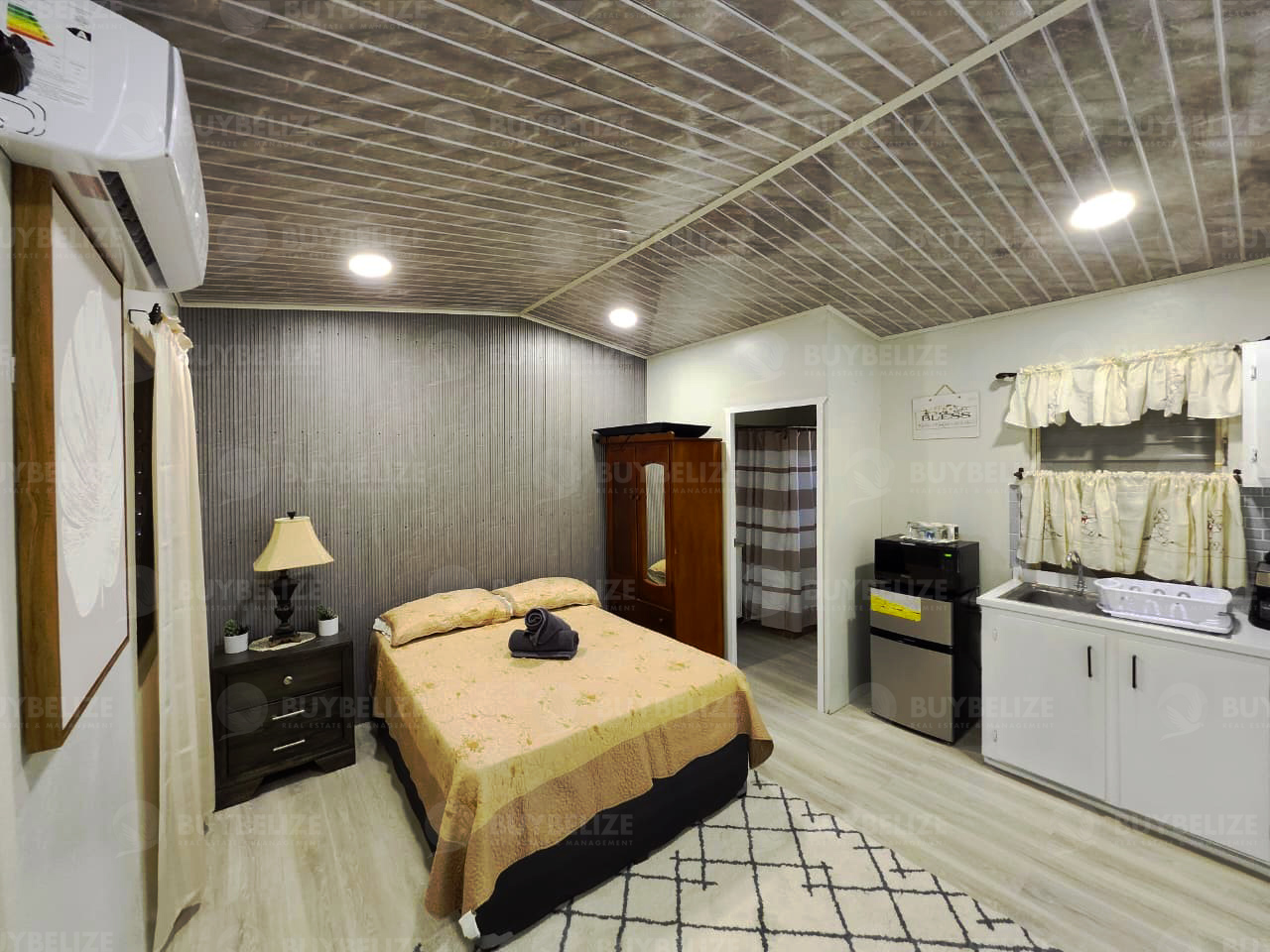 Buy Belize presents to you this modern and cozy studio apartment in Buttonwood Bay that offers both comfort and practicality. Perfect for single tenant or couple, this unit is conveniently designed with modern finishes and a homey atmosphere. The apartment features a comfortable sleeping area with air conditioning, private bathroom,mini refridgerator, microwave, sink and cabinets. The modern decor and essential furnishings makes this apartment ready to be your ideal and convenient living space.