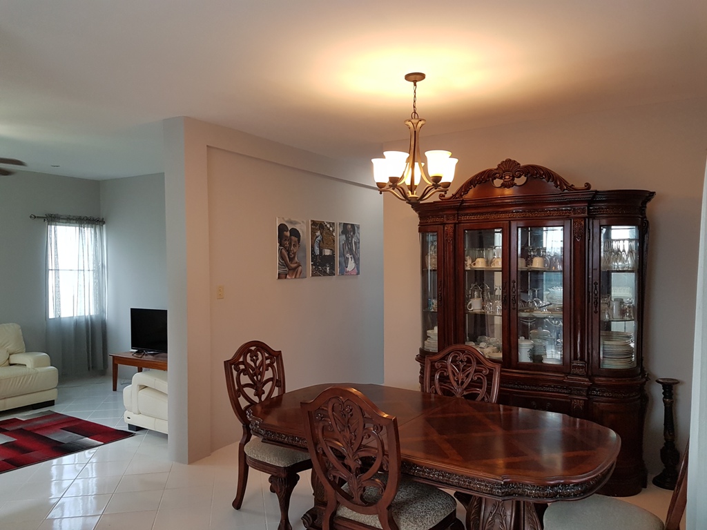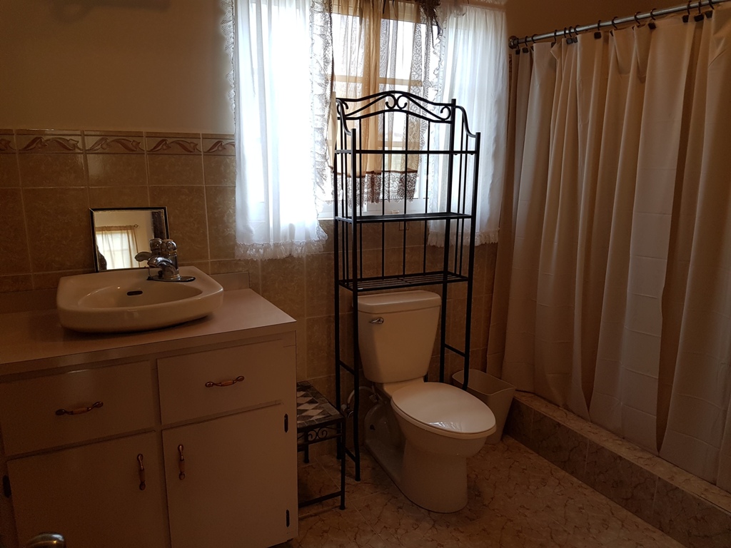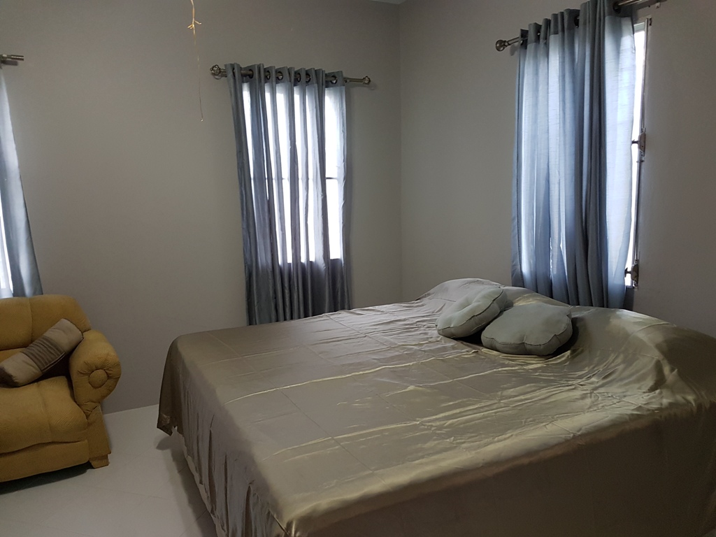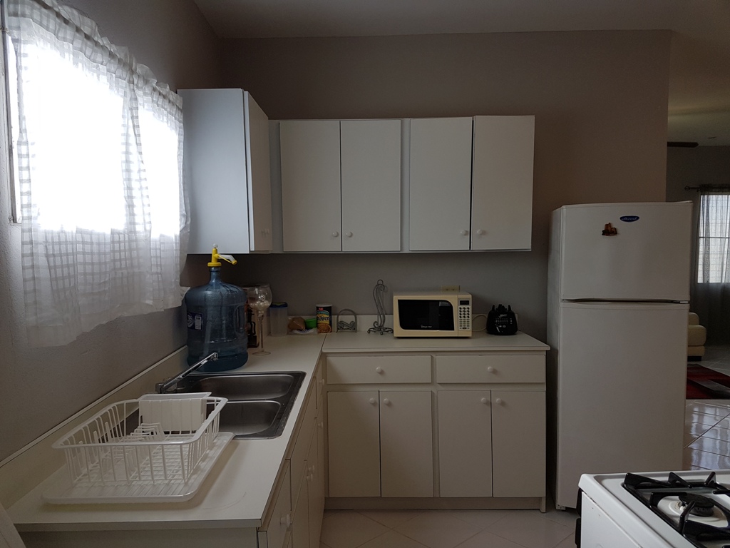 Fully furnished, 2 bedroom 2 bathrooms house in a great residential area of Belama Phase 1. This cozy home sits on a fenced property with a canal to the back and consists of 2 stories. The lower flat of the house has a spacious living room with brand new 3 piece sofa set and TV, a dining room with a large, beautiful mahogany table and a stunning china closet. The kitchen consists of a fridge, microwave, stove. Adjacent to the kitchen is the laundry that has the washer dryer along with an exit to the yard. The ground floor also consist of a bedroom with a king size bed and built in closet. The ground floor also has access to a full bathroom.