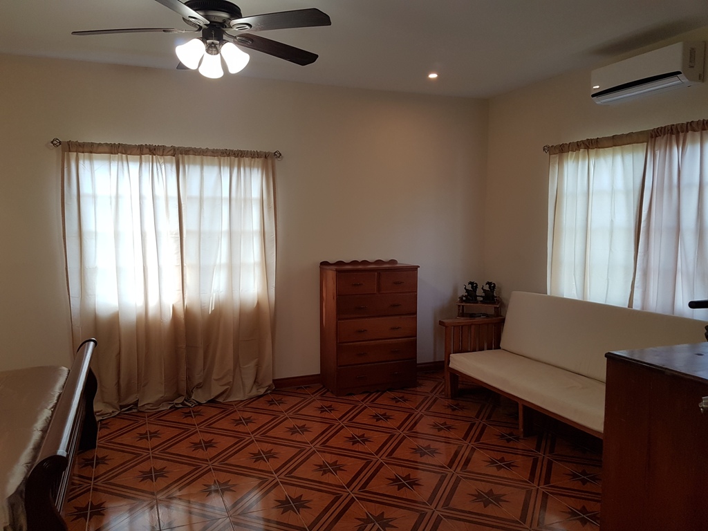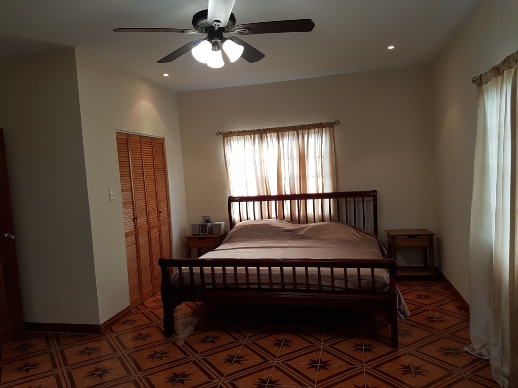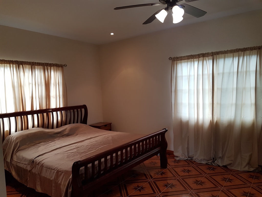 There is a beautiful wooden stairs with a built in storage room which leads to the huge, air conditioned master bedroom upstairs. This lovely, cool master bedroom has a king size bed, a built in walk in closet with enough space and its’ own large bathroom. It has windows, which, when opened, allow nice breeze to enter. The upper flat also has a door which leads to a small, but spacious veranda at the back of the house, which is also cool and a nice view.