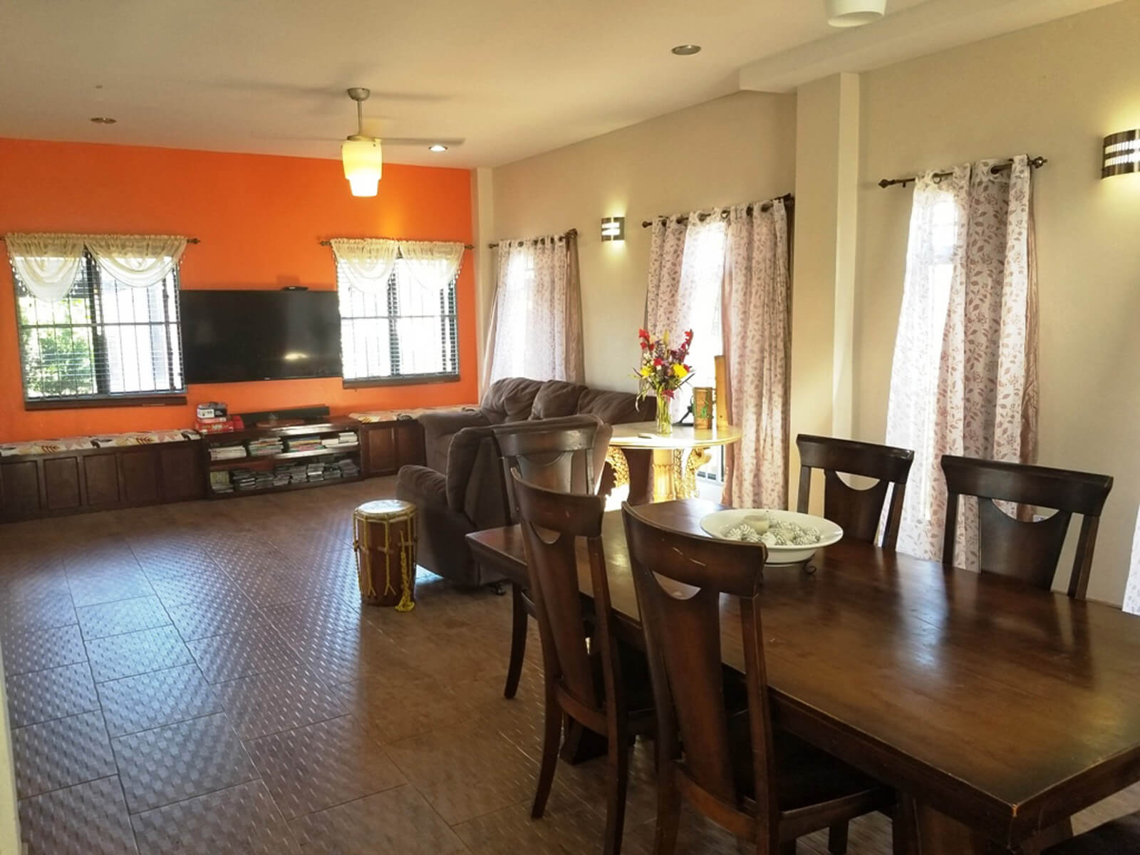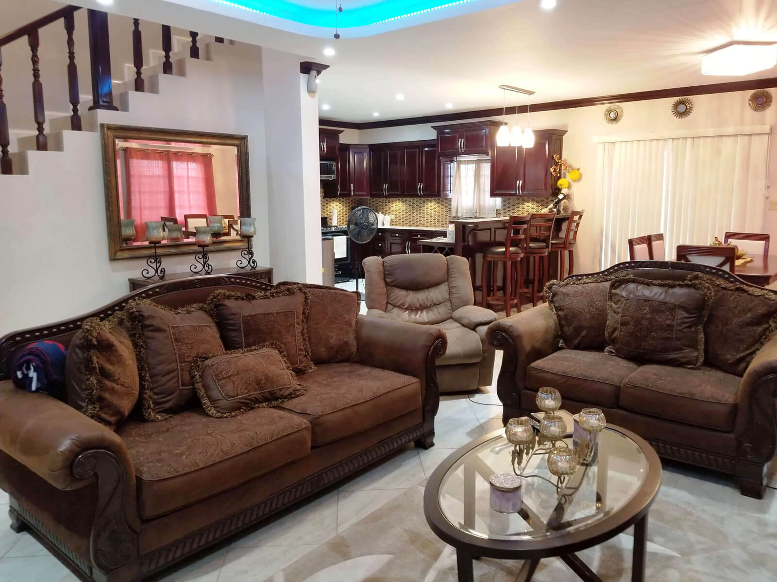 When entering the house, you walk into the large open living, dining, and kitchen area that is fully tiled with a contemporary style. The living area is able to fit large sofa sets and other furnisher to suit your needs. The dining area has a 6-seater dining table that is directly from the full equipped kitchen. The kitchen has a lot of cabinets for your dishware, plenty of counter-top space and all stainless-steel appliances to prepare all your family meals. Also, on the ground floor there is a full-size bedroom, bathroom, and laundry room.