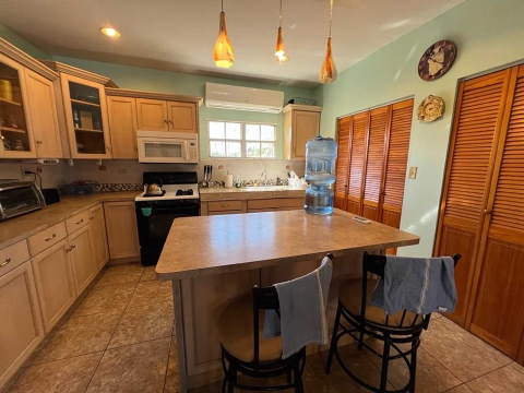 Once you enter the front door you enter into the open dining and kitchen. The kitchen is large to please any chef. The kitchen is equipped with sufficient cabinet space and has a Fridge, Stove, Microwave, Dishwasher and all other small appliances that one would need. The kitchen is sufficiently packed with enough cutleries for a family of 8. The kitchen also has a small island with two bar stools for those who wish for a quick breakfast in the morning.