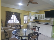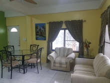 This is a spacious fully furnished 1 Bedroom apartment located on the ground floor in Buttonwood Bay area of Belize City. The apartment has an open dining kitchen and living room. The living room has a 2 seat couch that face a 42 inch flat screen T.V, while the dining area has an elegant glass table that seats 4. The kitchen is large enough for storage space for groceries and dishes. The kitchen is equipped with equipped with a Fridge, Stove with hood, Fridge, Coffee Maker, microwave, toaster and other small appliances. The Bedroom is large and is air conditioned. The bedroom has a large closet and has a queen size bed. The bathroom is large and has hot and cold water and is equipped with a tub. The laundry area at the back has individual washer & Dryer.