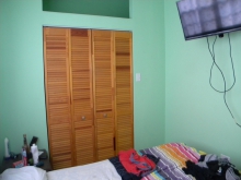 The upstairs house is a 2 Bedroom 2 Bathroom apartment with an open dining, kitchen and living room. The upstairs was recently done and made to look very modern with recess light, granite counter and top 18 inch tiles. The Living room is fairly large with 2 soft leather couches that face the 52 inch Flat Screen T.V. Adjoining the living room is the kitchen and dining. The dining room has 4 chair glass dining table, where as the kitchen is fully equipped with a granite counter top kitchen which also act as a breakfast bar. The kitchen is equipped with stainless steel Fridge, Stove and Microwave and the kitchen has ample cupboard space. From the kitchen there is a hallway that leads to the Master Bedroom on the left and the second bedroom and second bathroom on the right. The Second bedroom measures 10t x 9ft and has its own closet space along with a double bed inside. The second bathroom is a standing shower but also has a stackable washer and dryer inside. The Master Bedroom is beautiful and comes with Queen size Bed private closet and a mounted flat screen T.V. The Master Bedroom has its private full bathroom.