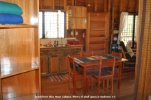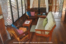 The cabana was designed with an open floor plan that allows guests to enjoy the fabulous breezes that flow throughout the house. The two bedrooms are separated by an enclosed bathroom, and there are bamboo curtain panels for each bedroom that can be closed for additional privacy.