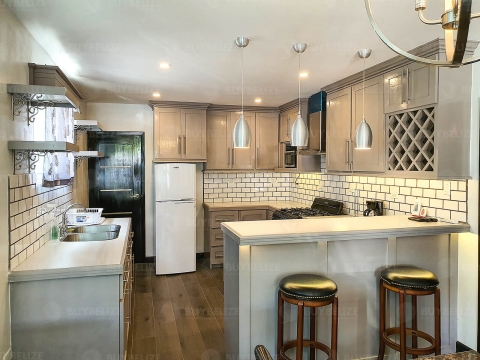 Upon entering the house, you are greeted by a modern styled open living, dining and kitchen area. The living and dining area have enough space to have a three-seater sofa set, Tv, small dining table and chairs. The kitchen is ready to equip all major appliances such as stove, refrigerator, and microwave. It has plenty of cabinet and counter-top space for all your meal preps. The kitchen also has a breakfast bar that can fit 3 persons comfortably. Beyond the kitchen the door leads to the laundry room that can fit a washer and dryer.