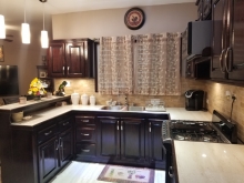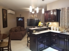 Upon entrance of the apartment one enters an open dining, kitchen and living room that is air conditioned. The living room consists of a 2-piece couch set with a flat screen T.V. From the living room there is an exit to the private front balcony, great for morning coffees. The dining table consist of a round 4-seater dining table. The kitchen is ideal for any chef as it a 15ft kitchen that comes fully equip with all appliances. The kitchen also has a 3-seater breakfast bar. Behind the kitchen area is back door along with a washer and dryer.