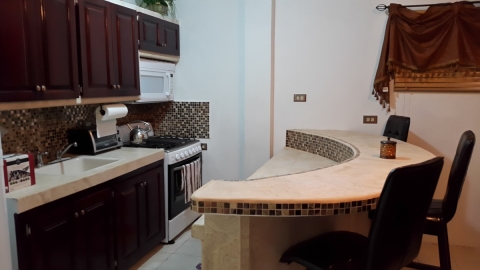 This beautiful apartment offers approximately 600 sq. ft. of living space and can comfortably fit a family of 4. The apartment has an open kitchen and living room. The living room has a comfortably brown couch that faces a 32 inch flat screen television which is equipped with a DVD player. The kitchen has beautiful tiled counters and dark wood cabinetry. It’s equipped with a large, concrete and tiled breakfast table with 3 tall and comfortably bar stools.