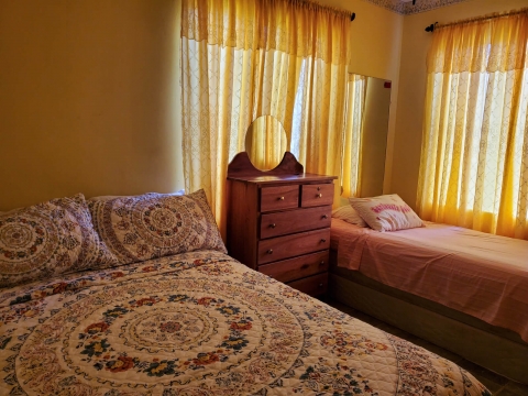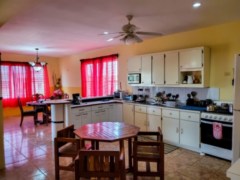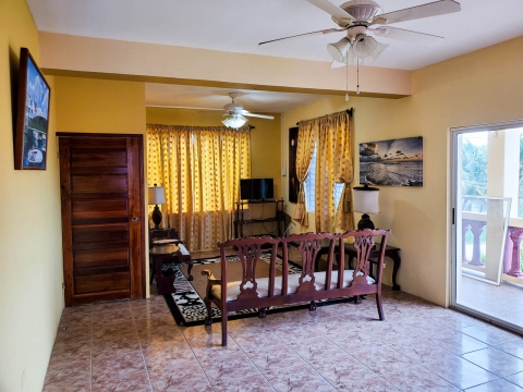 When entering the apartment, you are greeted by the open kitchen, living and dining room. The living room is large with plenty of room for added furnisher. Its fully tiled and has access to the balcony overlooking the neighbourhood with glimpse of the Caribbean Sea. Parallel, is the dining area where there is a four-seater dining table made of hardwood. The kitchen is large and fitted with plenty of cabinets and countertop space. Its equipped with all the necessary appliances needed to prepare a full meal. The one bathroom consists of a standing shower, a vanity, and a medicine cabinet. The two bedrooms are both spacious. One has a king size bed and the other has two beds, one being a double mattress and the other single. There is also an area for laundry.
