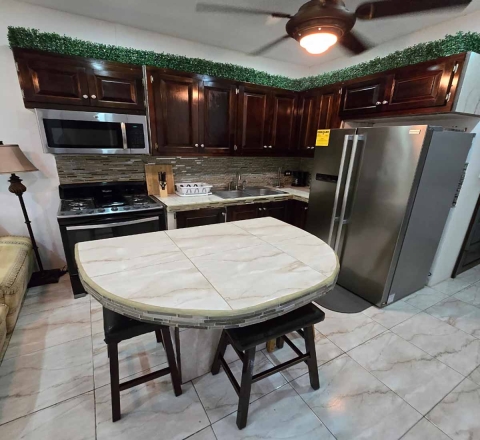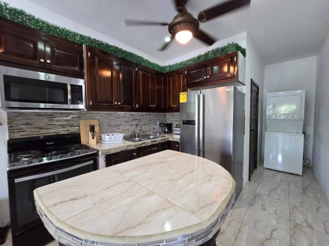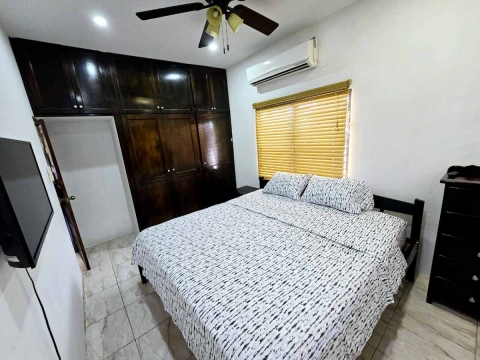 This is a beautiful and modern Fully Furnished 2 Bed 1 Bath apartment located in Ladyville. The apartment has an open dining kitchen and living room. The living room is equipped with a 3 seater couch set with a mounted flat screen T.V. The kitchen is concrete with tiled counter top and a Mahogany Cabinet finished. The kitchen area also has access to a breakfast bar. The kitchen is fully equipped with a fridge, stove, microwave hood, toaster oven, blender, coffee maker, toaster and other kitchen appliances. The kitchen dining living is air conditioned.