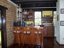 The house has white stucco inside and out with dark beamed ceilings and mixed hard word floors.