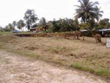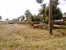 The land has been cleared save for a large tree and a few coconut and palm trees. The land is also at a slight slope.