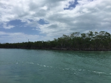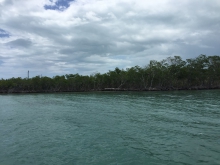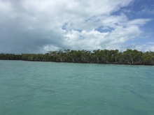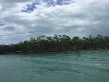 The land is currently in its natural state with mangrove trees growing in the forefront. There are also large trees growing on the far side of the land.