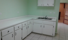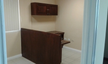 At the end of the corridor, there is a kitchen that comes furnished with Formica cabinets, sink and refrigerator. Just on the other side of the kitchen is a small nook that is used as a dining/common area for staff.