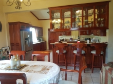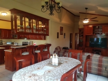 The home has two front entrances, one from the car garage and one from the front for visitors. Upon entrance one would enter into a foyer. From the foyer it is a step up to an open dining, kitchen and living room that is air conditioned. The living room is equipped with a 2 piece couch set and a beautiful wooden entertainment center with a flat screen T.V. The dining table is a beautiful wooden table with 6 seat. The kitchen is large and consist of a custom made wood. There are 3 bar stools for the breakfast bar. The kitchen is fully equipped with stainless steel electric stove and fridge. The kitchen also is fully equipped with pots, pans, plates, cups, utensils, toaster, coffee maker, and other small appliances. Behind the kitchen a door that leads to the laundry room that holds the washer, dryer, and heater. The laundry room does contain the back door.