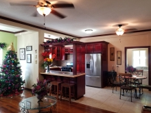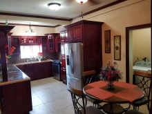 Upon entrance on walks in a small foyer for taking off shoes, umbrella, coats or other attire. Entering the home one would enter into an open dining, kitchen and living room. The living room is equipped with a section couch. The living room does come equipped with a fairly large flat screen T.V. The dining room is a beautiful glass circular dining table, with 4 chairs. The kitchen was finished with local hardwood and consist of a 3 seater breakfast bar. The kitchen is equipped with a fridge, stove and smaller appliances. From the dining room there is a laundry room that has access to its washer and dryer.