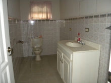 The home is of concrete construction and it has a tin roof with PVC gutters. There is an attached car garage, a large concrete parking area to the front of the house, and detached maid’s quarters in the back. All windows have decorative burglar bars and main entrance doors are protected. The house has ceramic floor tiles throughout, wooden kitchen cabinets, and popcorn stucco-style finish on the ceilings.